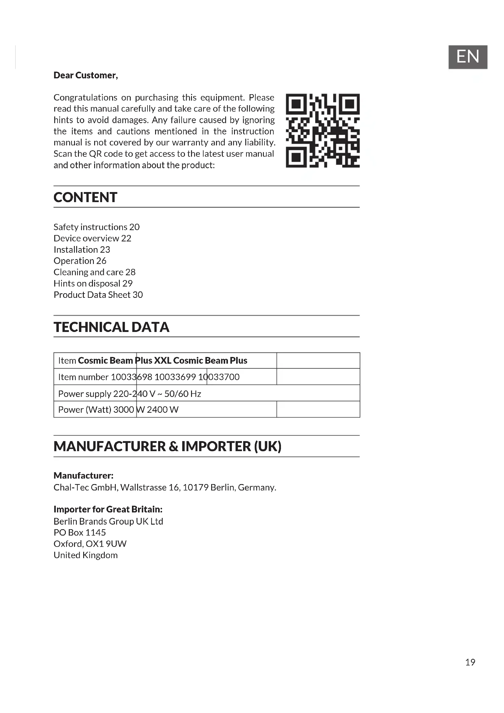 Dear Customer, Congratulations on purchasing this equipment. Please read this manual carefully and take care of the following hints to avoid damages. Any failure caused by ignoring the items and cautions mentioned in the instruction manual is not covered by our warranty and any liability. Scan the QR code to get access to the latest user manual and other information about the product: CONTENT TECHNICAL DATA Item Cosmic Beam Plus XXL Cosmic Beam Plus Item number 10033698 10033699 10033700 Power supply 220-240 V ~ 50/60 Hz Power (Watt) 3000 W 2400 W MANUFACTURER & IMPORTER (UK) Manufacturer: Chal-Tec GmbH, Wallstrasse 16, 10179 Berlin, Germany. Importer for Great Britain: Berlin Brands Group UK Ltd PO Box 1145 Oxford, OX1 9UW United Kingdom Safety instructions20 Device overview22 Installation23 Operation26 Cleaning and care28 Hints on disposal29 Product Data Sheet3020
