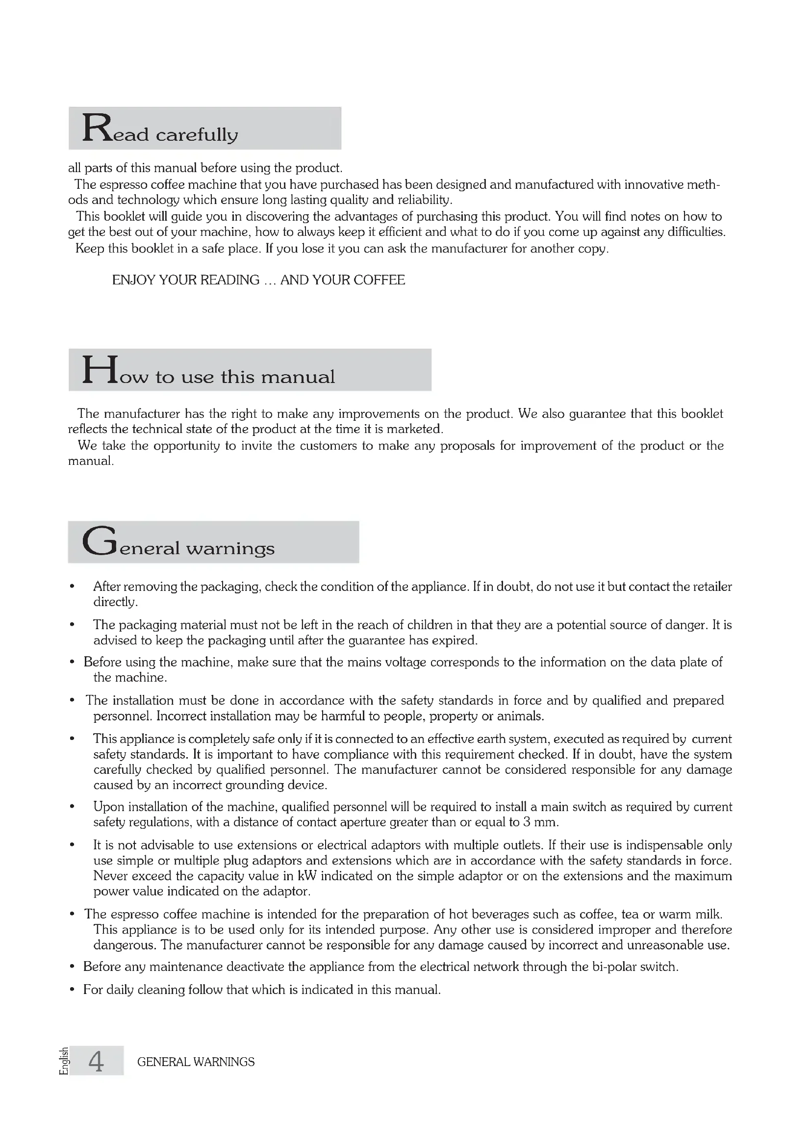 - For daily cleaning follow that which is indicated in this manual. Read carefully How to use this manual General warnings5 EnglishPRESENTATION ENGLISH