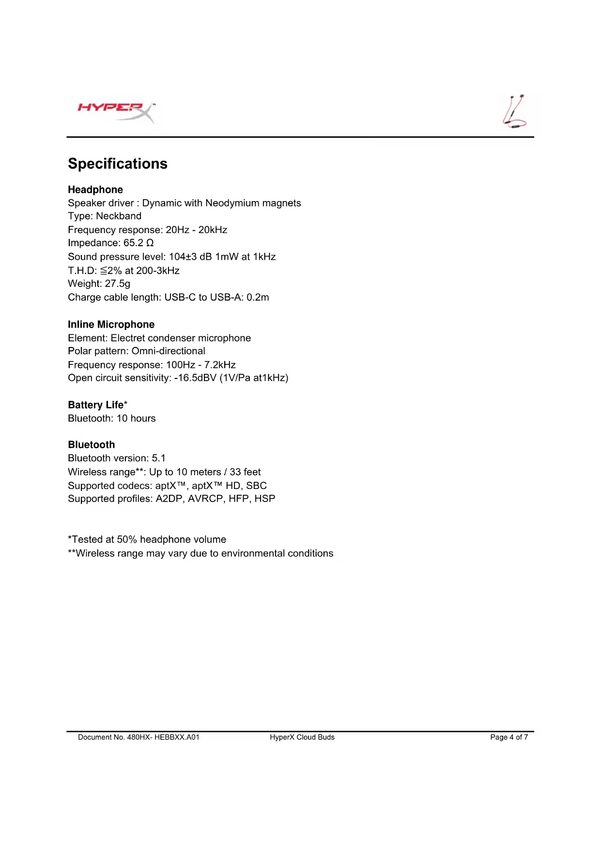 *Tested at 50% headphone volume **Wireless range may vary due to environmental conditionsDocument No. 480HX- HEBBXX.A01 HyperX Cloud Buds Page 5 of 7