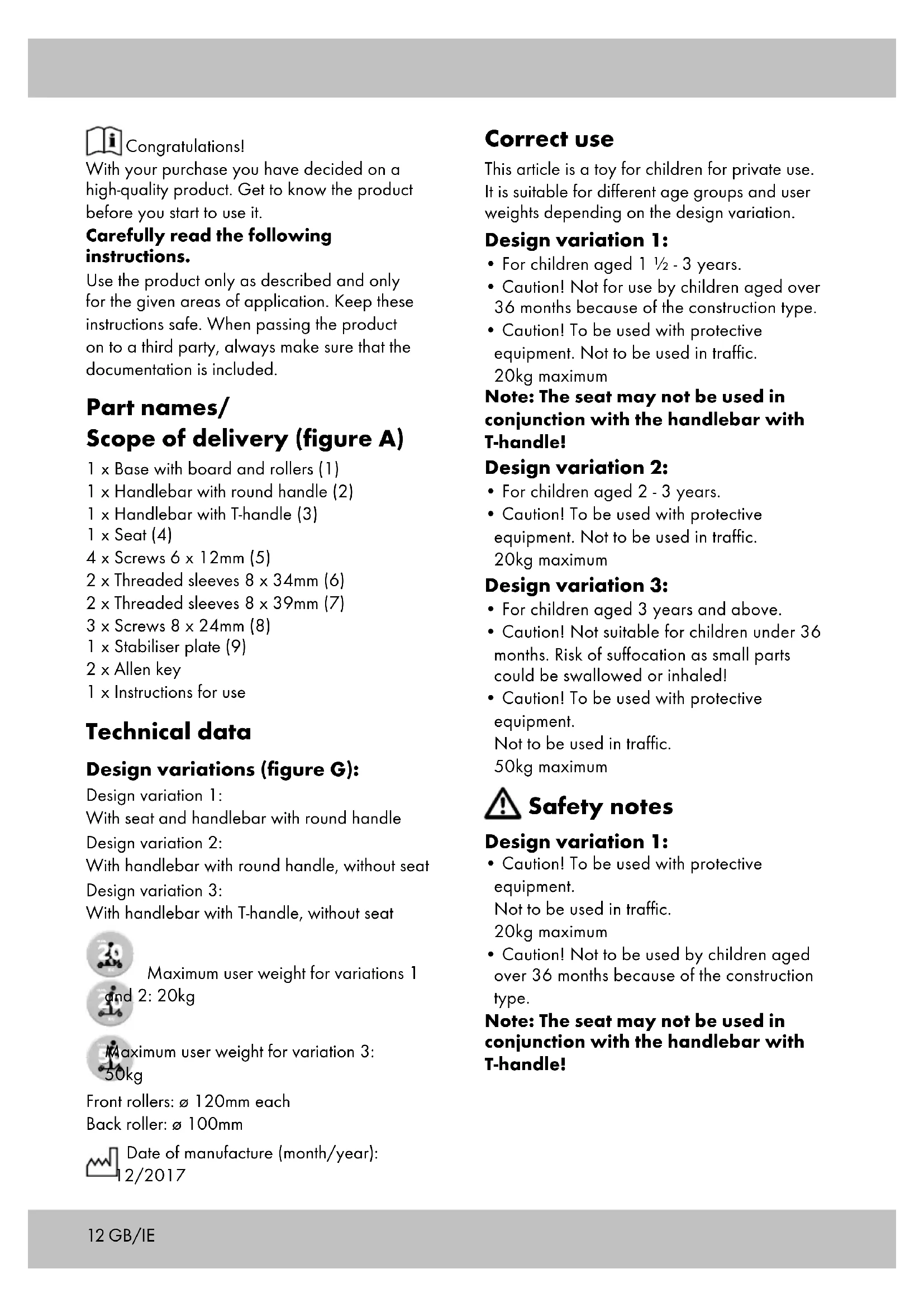 - Avoid water, oil, potholes, and very rough surfaces. Assembly Assembling the handlebar (figure B) You will need the base (1) and the handlebar with the round handle (2) for design variations 1 and 2 or the handlebar with the T-handle (3) for design variation 3. Press the pin (2a, 3a) and insert the handlebar into the base. Important: Please ensure that the hand- lebar clicks into the base. Assembly of design variation 1 (figure C) Lay the seat (4) onto the base (1). Please ensure that the drill holes on the seat and the base are directly above one another. Insert the short sleeves (6) through the two front drill holes from above and secure them from below using two screws (5). Insert the long sleeves (7) through the two back drill holes and back drill holes on the stabiliser plate (9) from above. Secure these from below using two screws (5). Insert a screw (8) in the front drill hole on the stabiliser plate and tighten it (figure D). Use the included Allen key for the assembly. Assembly of design variation 2 (figure E) Secure the stabiliser plate at the back three drill holes using the screws (8) and tighten the screws with the included Allen key. Adjusting the height of the seat (figure F) The seat can be set to different heights between approximately 26 - 32cm. To make this adjust- ment release the locking screw (4a) and set the desired height. Tighten the locking screw again.14 GB/IE Dismantling Dismantling the handlebar Press the pin on the back of the base (2a, 3a) and pull the handlebar out (figure B). Dismantling the seat Release the screws and pull the threaded sleeves out. Remove the seat. Use Riding Depending on the design variation, sit on the seat and create momentum by pushing off with both legs at regular intervals, or, if using the scooter without a seat, stand on the board with one leg and create momentum by pushing off regularly with the other leg. The article is steered by shifting weight. Braking When using design variation 1 with the seat, brake by putting both feet on the ground. When using the article without the seat, brake by step- ping onto the friction brake on the back wheel with one foot. Maintenance Exchanging the front rollers You can change the front rollers. Important! Pay attention to the technical data. Rollers with a different diameter can change the riding conditions and pose a risk to the user in some circumstances. Do not use any rollers that cannot be fitted perfectly. Never fit rollers that are larger than the original rollers on the article. Rollers suffer wear. The wear depends on many factors such as the ground, size and weight of the user, weather conditions, roller material and their degree of hardness. It is therefore necessary to exchange them from time to time.