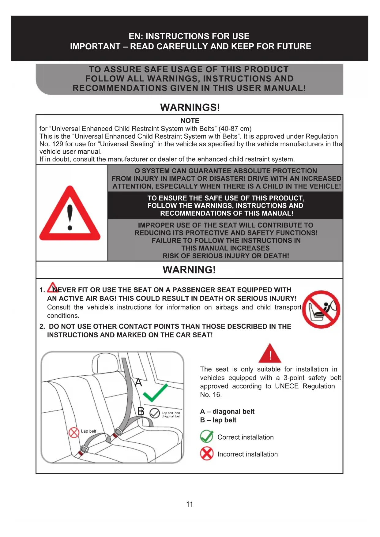 WARNINGS! NOTE for “Universal Enhanced Child Restraint System with Belts” (40-87 cm)This is the “Universal Enhanced Child Restraint System with Belts”. It is approved under Regulation No. 129 for use for “Universal Seating” in the vehicle as specied by the vehicle manufacturers in the vehicle user manual.If in doubt, consult the manufacturer or dealer of the enhanced child restraint system.O SYSTEM CAN GUARANTEE ABSOLUTE PROTECTIONFROM INJURY IN IMPACT OR DISASTER! DRIVE WITH AN INCREASEDATTENTION, ESPECIALLY WHEN THERE IS A CHILD IN THE VEHICLE!TO ENSURE THE SAFE USE OF THIS PRODUCT,FOLLOW THE WARNINGS, INSTRUCTIONS AND RECOMMENDATIONS OF THIS MANUAL!IMPROPER USE OF THE SEAT WILL CONTRIBUTE TO REDUCING ITS PROTECTIVE AND SAFETY FUNCTIONS!FAILURE TO FOLLOW THE INSTRUCTIONS IN THIS MANUAL INCREASESRISK OF SERIOUS INJURY OR DEATH! WARNING! 1. NEVER FIT OR USE THE SEAT ON A PASSENGER SEAT EQUIPPED WITH AN ACTIVE AIR BAG! THIS COULD RESULT IN DEATH OR SERIOUS INJURY! Consult the vehicle’s instructions for information on airbags and child transport conditions.2. DO NOT USE OTHER CONTACT POINTS THAN THOSE DESCRIBED IN THE INSTRUCTIONS AND MARKED ON THE CAR SEAT!Lap beltLap belt anddiagonal belt