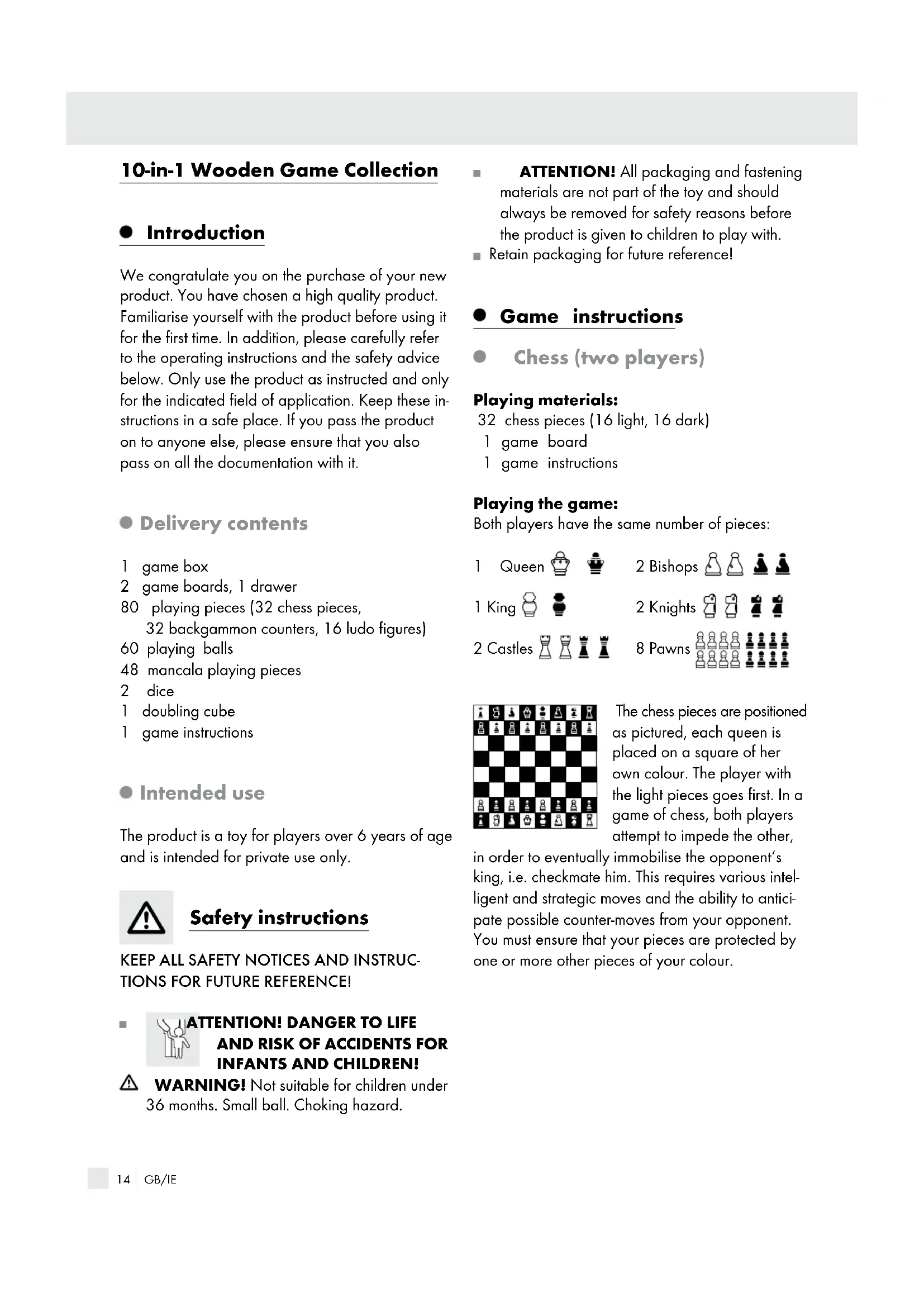 INFANTS AND CHILDREN! WARNING! Not suitable for children under 36 months. Small ball. Choking hazard. ATTENTION! All packaging and fastening materials are not part of the toy and should always be removed for safety reasons before the product is given to children to play with. Retain packaging for future reference! Game instructions Chess (two players) Playing materials: 32 chess pieces (16 light, 16 dark) 1 game board 1 game instructions Playing the game: Both players have the same number of pieces: 1 Queen 2 Bishops 1 King 2 Knights 2 Castles 8 Pawns The chess pieces are positioned as pictured, each queen is placed on a square of her own colour. The player with the light pieces goes first. In a game of chess, both players attempt to impede the other, in order to eventually immobilise the opponent‘s king, i.e. checkmate him. This requires various intel- ligent and strategic moves and the ability to antici- pate possible counter-moves from your opponent. You must ensure that your pieces are protected by one or more other pieces of your colour.15 GB/IE Moving the chess pieces: Queen With the queen, a player can move as many squares as desired, in all directions, i.e. diagonally, vertically and horizontally. King With the king, a player can move in any direction (diago- nally, vertically, horizontally), but only by one square per turn. When the king is threa- tened, he may not be treated like any other piece. A player must warn that the king is under threat by calling „check“. Castle With the castle, a player can move as many squares as desired, either vertically or horizontally. The opponent‘s pieces can only be attacked and captured within this row of squares. Bishop The bishops can be moved any desired number of squares, but only in a diagonal direc- tion. Since the bishops may never change their square colour, they can only be atta- cked or captured on a square of „their“ colour. Knight The knight is the only piece with which a player may jump over other pieces. It is a parti- cularly manoeuvrable piece. Moves using the knight are made as follows: „one square ahead, then one square diagonally“. That means that moves made with a knight always end on squares of the other colour. Pawns Pawns can only be moved forwards by one or two squa- res - however they can only be moved two squares from their starting position. As soon as the pawns are outside of their starting position, they may only be moved one square per turn. The pawns can neither move backwards, nor attack or capture other pieces in a backwards direction. Pawns can only be used to capture opposing pieces by moving in a diagonal direction. If you succeed in moving a pawn all the way to your op- ponent‘s base line, you can swap it for another piece that your opponent took from you in a previous move, regardless of whether or not the same pieces are already in the game. Capturing: When a chess piece is captured, the attacking piece takes the place of the piece which was removed from the board. An „en passant“ capture may only be made if a pawn is moved from the starting position. If a player moves a pawn two squares16 GB/IE forward from its starting position and over a threa- tened square, coming to rest next to an opponent‘s pawn, then the opponent‘s pawn can capture the player‘s pawn in the next move by moving to the previously threatened square. That means that the opponent‘s pawn stands on the square that it threa- tened and the captured pawn is removed from the board. „En passant“ moves are not obligatory. Castling: This is a double move, in which the king and castle are moved at the same time. This move serves to bring the king into a particularly protected position. Castling is only possible, – if neither the king nor the castle was moved in a previous turn, – if no other pieces find themselves between the king and the castle, – if the king is not in check, – if this move does not put the king under threat (check). Checkmate: If the king is threatened by an opposing piece, he is in „check“. This term must be spoken aloud by the attacking player. Now the other player must free his king from this situation. To do this there are a number of possibilities: the piece threatening the king can be captured, the king can be moved to another square which is not under threat, or another piece can be moved into the line of attack in order to defend the king. Checkmate means that the op- posing king can no longer be saved from a position of check by using any of the previously described counter-moves, and will be captured in the following turn. Draw: In the final stages of the game, situations can occur in which neither player can put their opponent in check. The game now ends in a draw. Both players must agree to the draw. Backgammon (two players) Playing materials: 30 backgammon counters (15 light, 15 dark) 2 dice 1 doubling cubes 1 game board 1 game instructions Preparing the game: The game board is positioned between the two players so that each player is sitting in front of a spiked box with 12 pointed triangles (the so-called POINTS). The playing area is split into 4 tables and the colours dark and light are assigned. The dark inner table (the so-called home board) is in the top right, the dark outer table (the so-called outer board) in the top left, the light inner board in the bottom right and the light outer board in the bottom left. The upper POINTS (1–12) are the dark POINTS, the lower points (13–24) are the light POINTS. Each player receives 15 counters, which are distributed on the game board as follows: Home-BoardOuter-Board Bar dark playing direction light playing direction DARK: 2 counters on POINT 24 5 counters on POINT 13 3 counters on POINT 8 5 counters on POINT 617 GB/IE LIGHT: 2 counters on POINT 1 5 counters on POINT 12 3 counters on POINT 17 5 counters on POINT 19 Players roll using 2 normal dice and 1 doubling cube. Aim of the game: Both players attempt to get their