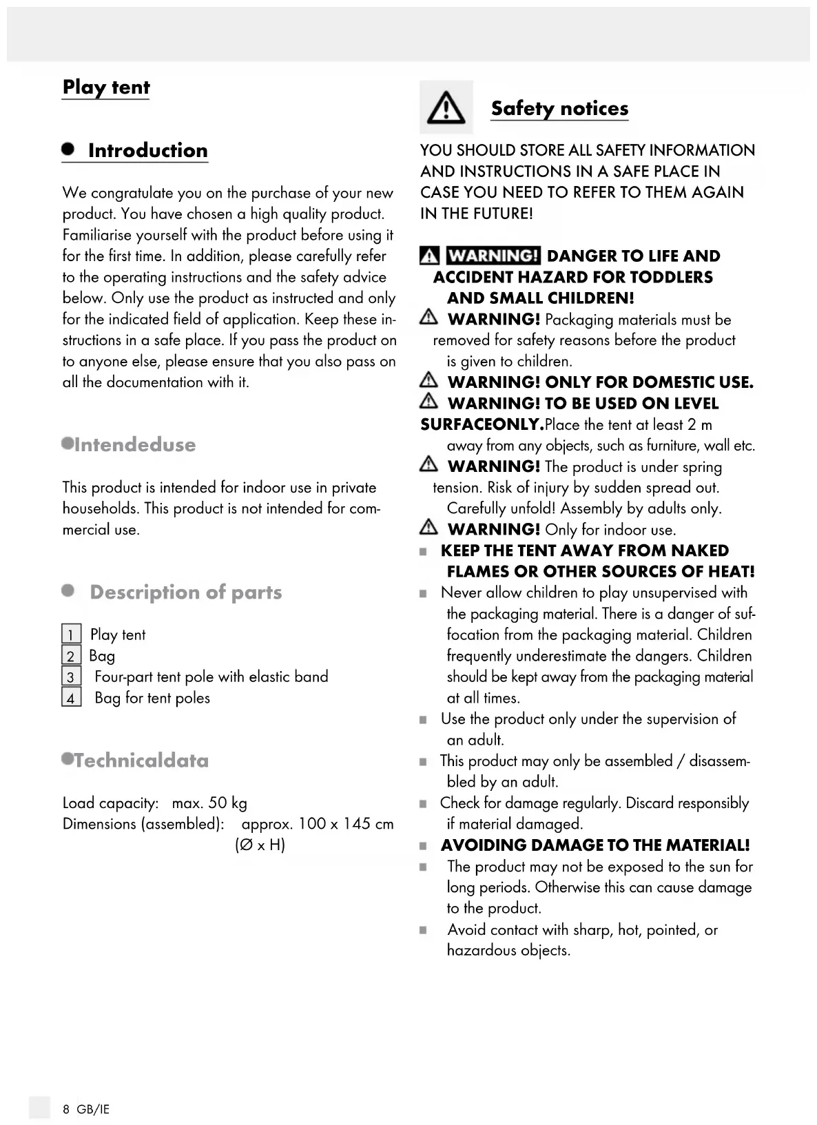 at all times. Use the product only under the supervision of an adult. This product may only be assembled / disassem- bled by an adult. Check for damage regularly. Discard responsibly if material damaged. AVOIDING DAMAGE TO THE MATERIAL! The product may not be exposed to the sun for long periods. Otherwise this can cause damage to the product. Avoid contact with sharp, hot, pointed, or hazardous objects.9 GB/IE Assembly WARNING! Assembly must be carried out by an adult. The product is spring-loaded.