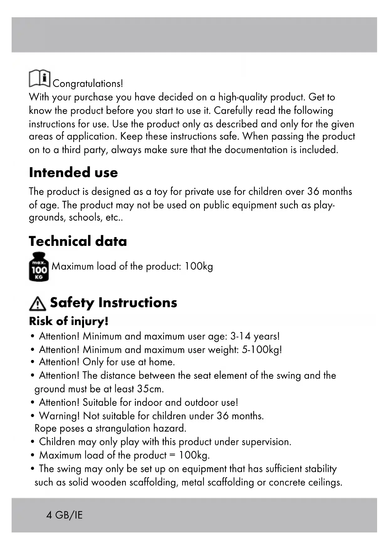 - - 35 Gebrauchsanweisung - 414 GB/IE Congratulations! With your purchase you have decided on a high-quality product. Get to know the product before you start to use it. Carefully read the following instructions for use. Use the product only as described and only for the given areas of application. Keep these instructions safe. When passing the product on to a third party, always make sure that the documentation is included. Intended use The product is designed as a toy for private use for children over 36 months of age. The product may not be used on public equipment such as play- grounds, schools, etc Technical data Maximum load of the product: 100kg Safety Instructions Risk of injury! p. 36
