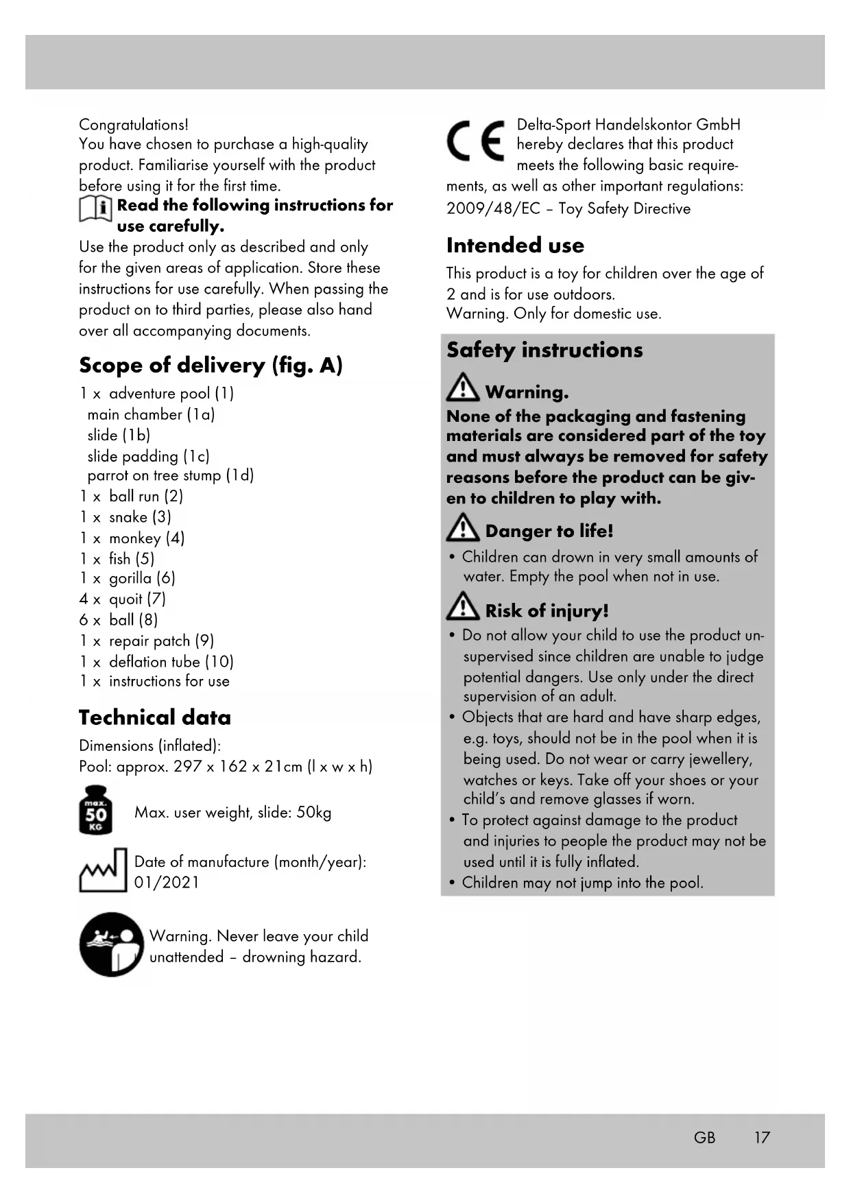 damaged area and press tight. Storage, cleaning Exchange the water in the product frequently, es- pecially in hot weather and if it is soiled. When not in use, always store the product clean, dry and uninflated at room temperature. The valves should always be closed during storage. Clean the product only with water or soapy water, never with abrasive detergents. When storing for the winter do not put any sharp objects on the product and do not apply talcum powder. Disposal Dispose of the article and the packaging materi- als in accordance with current local regulations. Packaging materials such as foil bags are not suitable to be given to children. Keep the pack- aging materials out of the reach of children. Dispose of the products and the packaging in an environmentally friendly manner. The recycling code is used to identify various materials for recycling. The code consists of the recycling symbol – which is meant to reflect the recycling cycle – and a number which identifies the material. Notes on the guarantee and service handling The product was produced with great care and under constant supervision. You receive a three- year warranty for this product from the date of purchase. Please retain your receipt. The warranty applies only to material and workmanship and does not apply to misuse or improper handling. Your statutory rights, espe- cially the warranty rights, are not affected by this warranty. With regard to complaints, please contact the following service hotline or contact us by e-mail. Our service employees will advise as to the subsequent procedure as quickly as possible. We will be personally available to discuss the situation with you. Any repairs under the warranty, statutory guar- antees or through goodwill do not extend the warranty period. This also applies to replaced and repaired parts. Repairs after the warranty are subject to a charge. IAN: 351980_2007 Service Great Britain Tel.: 0800 404 7657 E-Mail: deltasport@lidl.co.uk21222311.23.2020 / AM 9:44