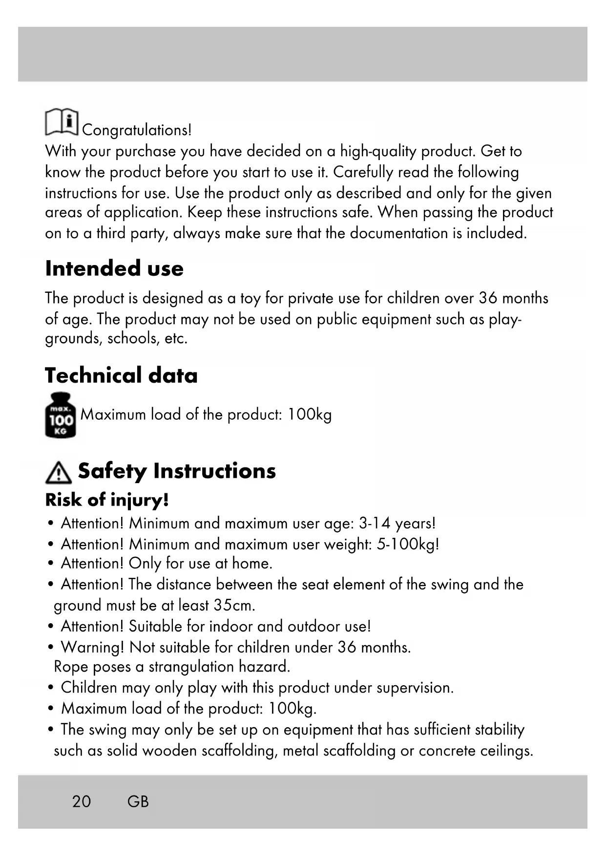 - The swing may only be set up on equipment that has sufficient stability such as solid wooden scaffolding, metal scaffolding or concrete ceilings. GB21GB