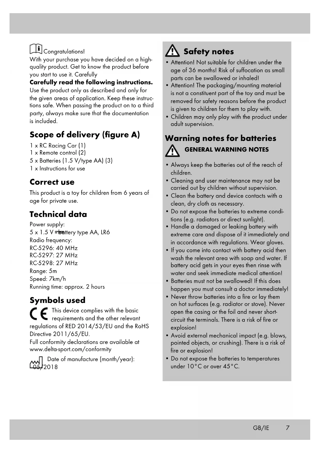 - Children may only play with the product under adult supervision. Warning notes for batteries