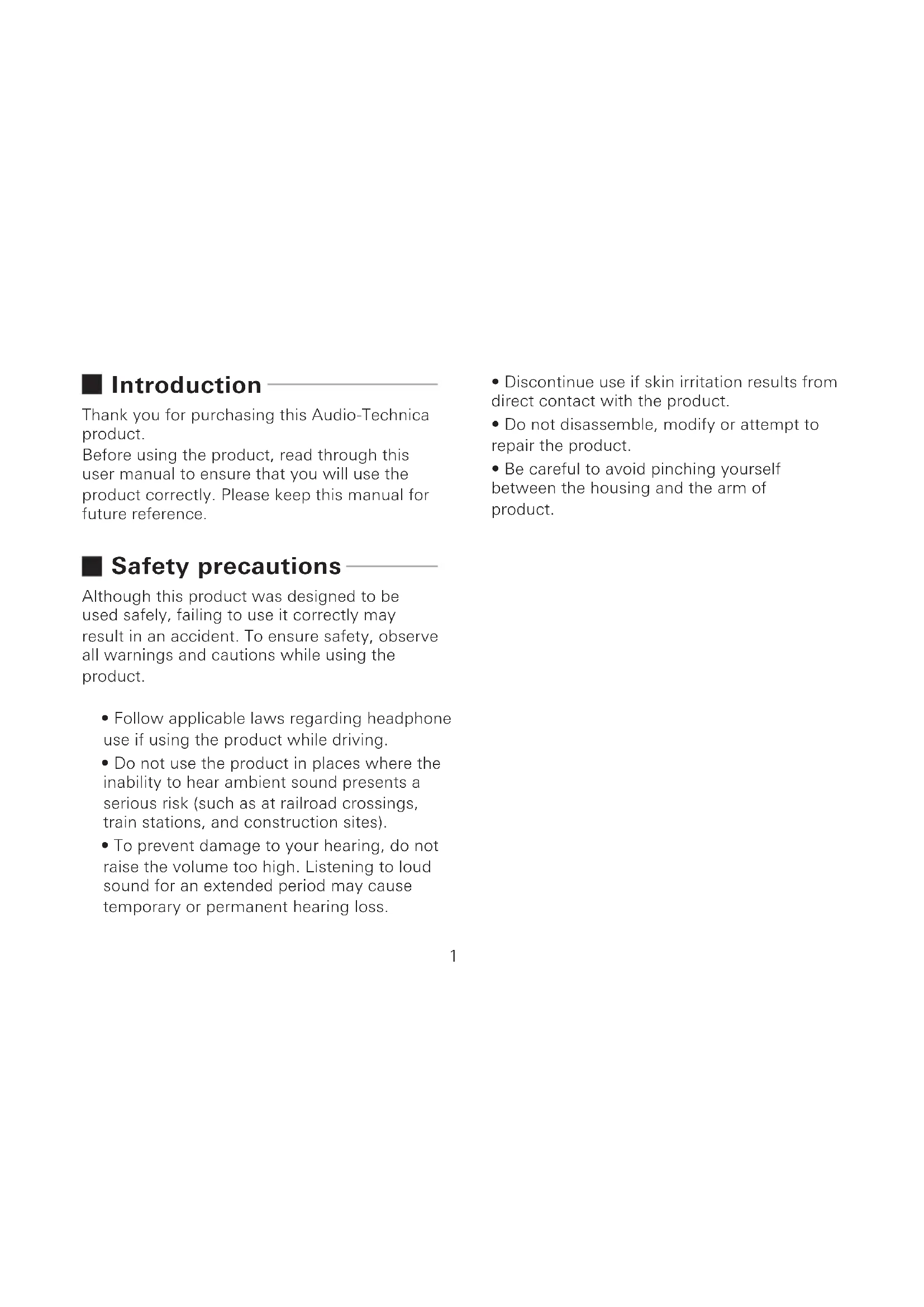 ホームページ(サポート) www.audio-technica.co.jp/atj/support/1 Introduction Thank you for purchasing this Audio-Technica product. Before using the product, read through this user manual to ensure that you will use the product correctly. Please keep this manual for future reference. Safety precautions Although this product was designed to be used safely, failing to use it correctly may result in an accident. To ensure safety, observe all warnings and cautions while using the product.