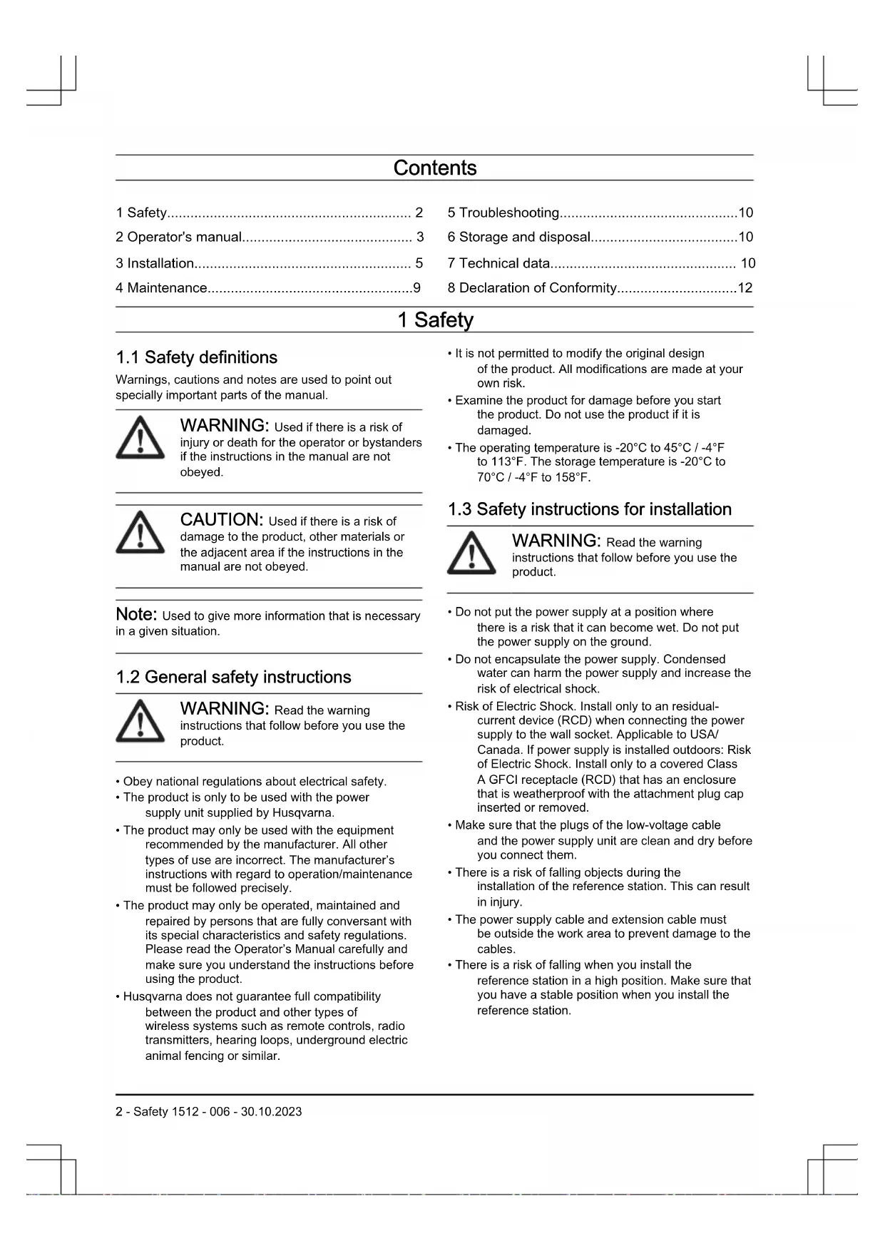 system contains a robotic lawn mower, a charging station and a reference station. The robotic lawn mower and the reference station receives satellite signals for positioning. The reference station is stationary and sends correction data to the robotic lawn mower to get an accurate position for the mower. The work area is made virtually in an app by operating the product and adding waypoints to make a map in an app. 1512 - 006 - 30.10.2023 Operator's manual - 32.1.4 Product overview