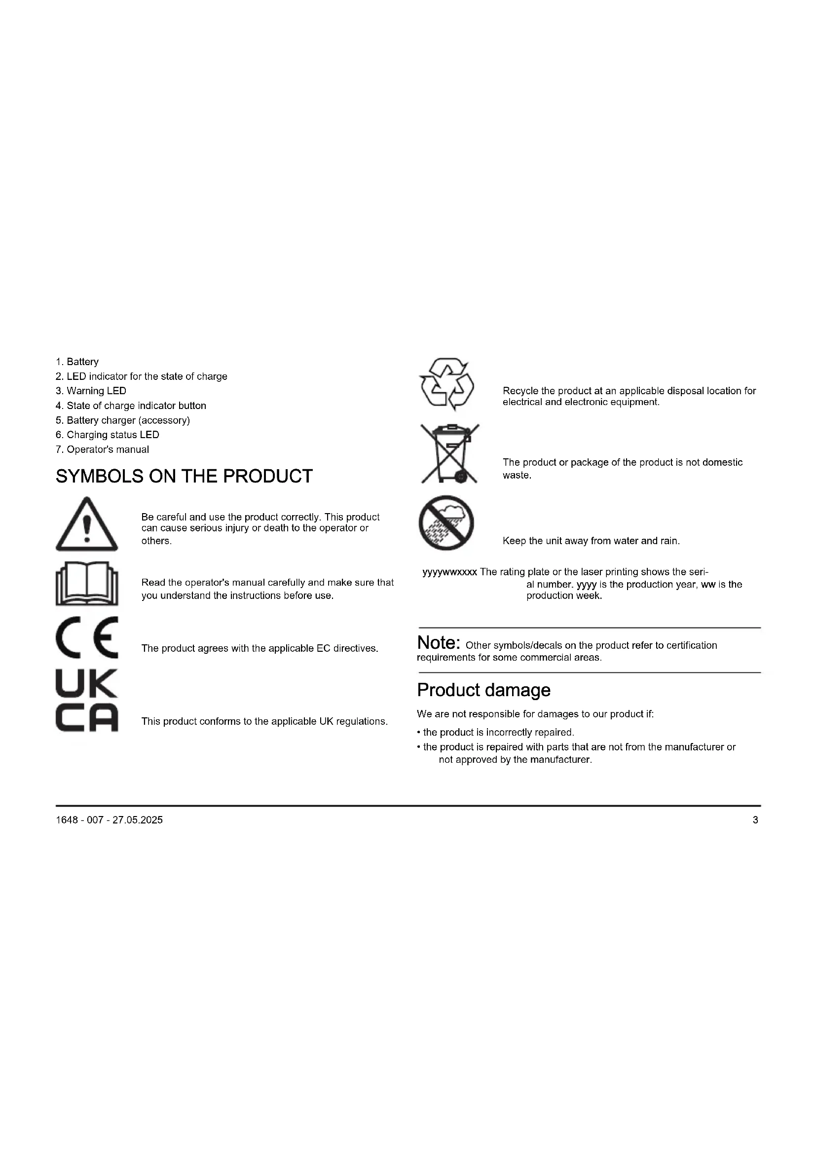 Be careful and use the product correctly. This product can cause serious injury or death to the operator or others. Read the operator's manual carefully and make sure that you understand the instructions before use. The product agrees with the applicable EC directives. This product conforms to the applicable UK regulations. Recycle the product at an applicable disposal location for electrical and electronic equipment. The product or package of the product is not domestic waste. Keep the unit away from water and rain. yyyywwxxxx The rating plate or the laser printing shows the seri- al number. yyyy is the production year, ww is the production week. Note: Other symbols/decals on the product refer to certification requirements for some commercial areas. Product damage We are not responsible for damages to our product if:
