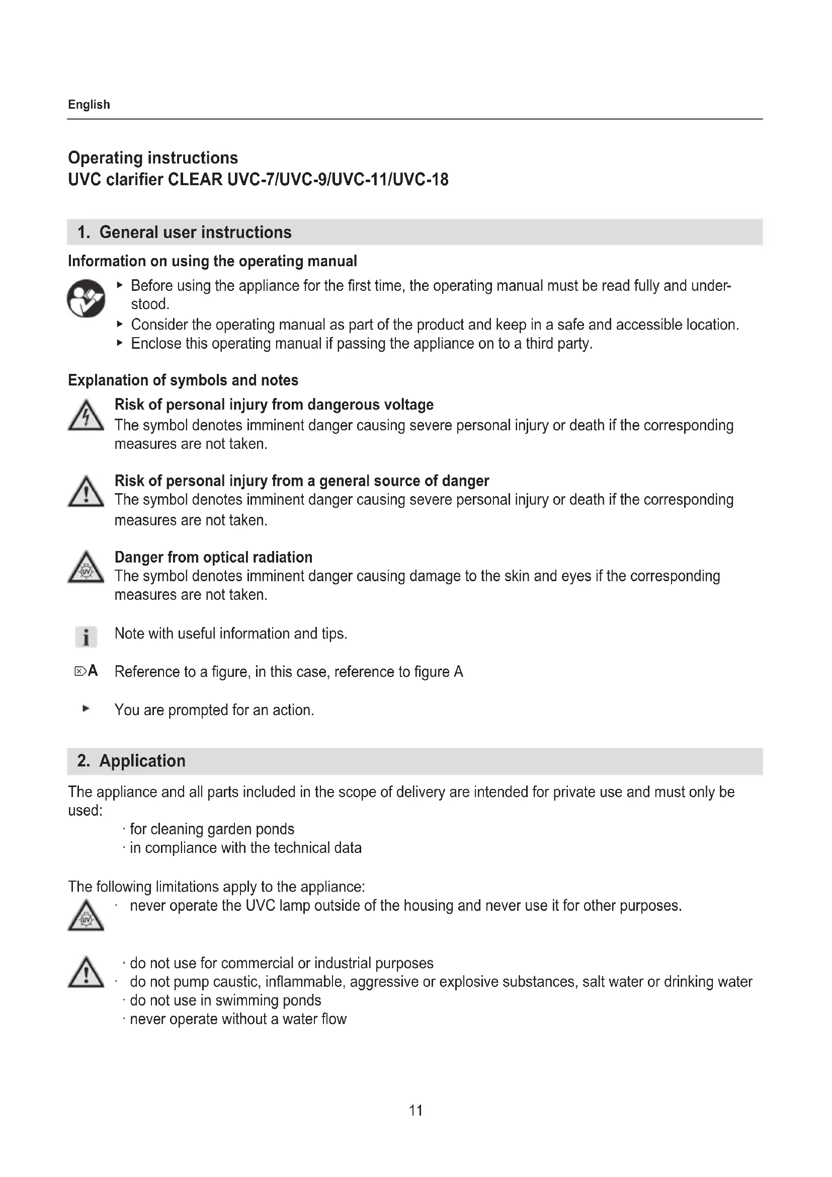 The appliance and all parts included in the scope of delivery are intended for private use and must only be used: ‧ for cleaning garden ponds ‧ in compliance with the technical data The following limitations apply to the appliance: ‧ never operate the UVC lamp outside of the housing and never use it for other purposes. ‧ do not use for commercial or industrial purposes ‧ do not pump caustic, inammable, aggressive or explosive substances, salt water or drinking water ‧ do not use in swimming ponds ‧ never operate without a water ow ⌦A12 English