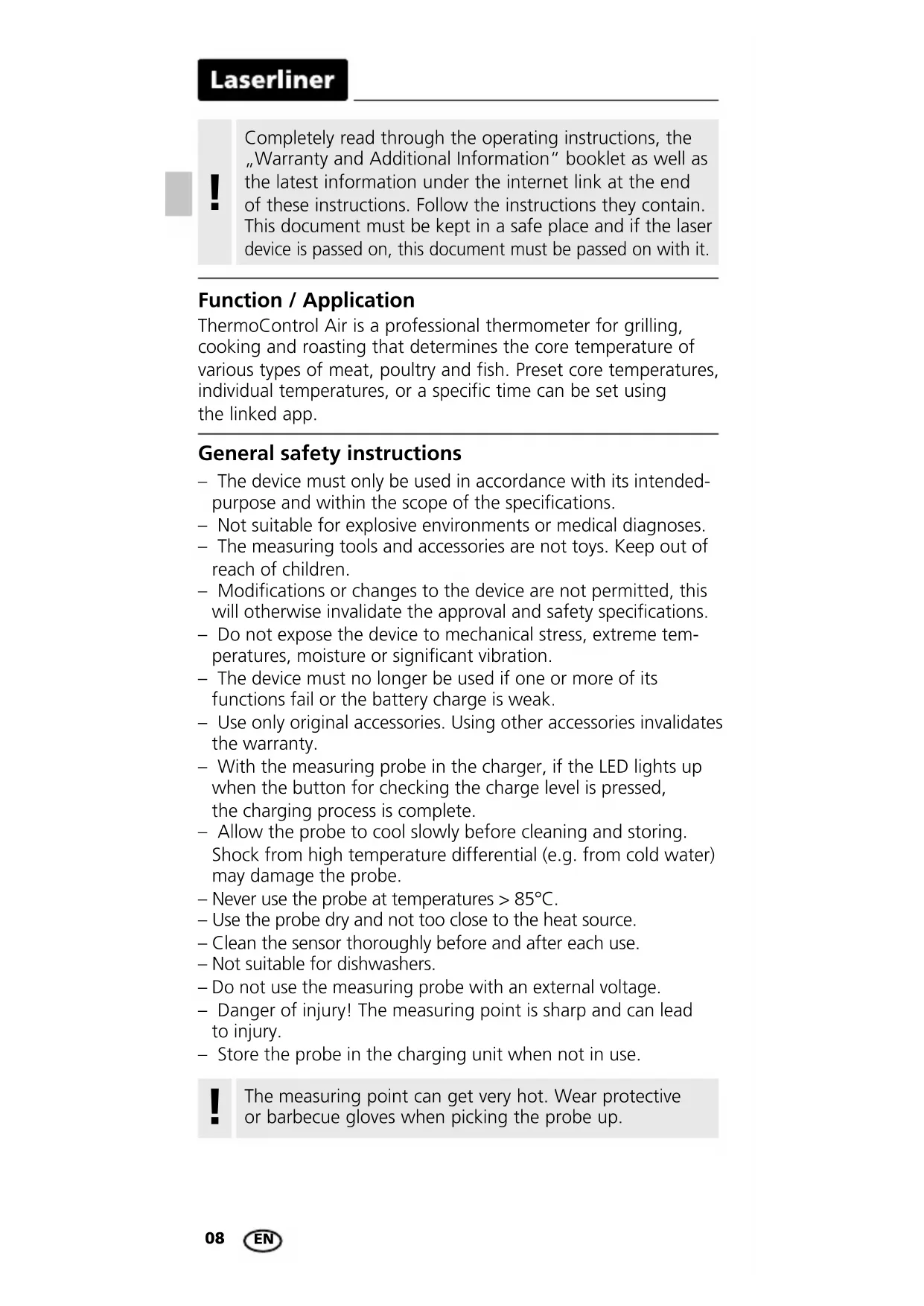 General safety instructions – The device must only be used in accordance with its intended- purpose and within the scope of the specications. – Not suitable for explosive environments or medical diagnoses. – The measuring tools and accessories are not toys. Keep out of reach of children. – Modications or changes to the device are not permitted, this will otherwise invalidate the approval and safety specications. – Do not expose the device to mechanical stress, extreme tem- peratures, moisture or signicant vibration. – The device must no longer be used if one or more of its functions fail or the battery charge is weak. – Use only original accessories. Using other accessories invalidates the warranty. – With the measuring probe in the charger, if the LED lights up when the button for checking the charge level is pressed, the charging process is complete. – Allow the probe to cool slowly before cleaning and storing. Shock from high temperature differential (e.g. from cold water) may damage the probe. – Never use the probe at temperatures > 85°C. – Use the probe dry and not too close to the heat source. – Clean the sensor thoroughly before and after each use. – Not suitable for dishwashers.