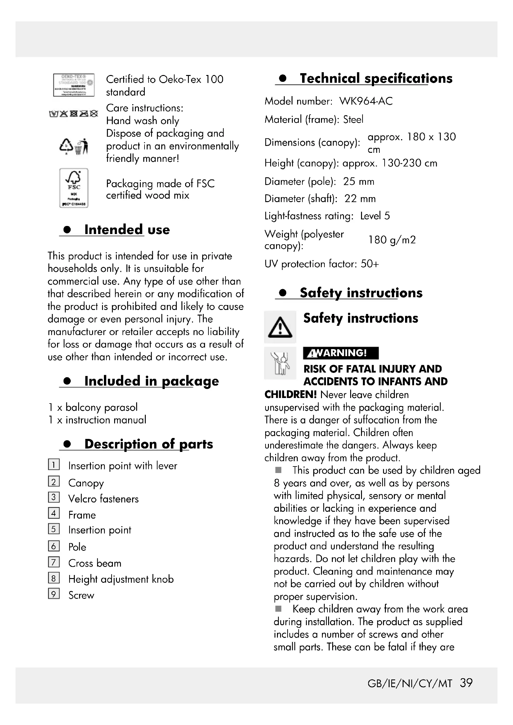 Service Suisse Tél.: 00800 80040044 E-Mail: administration@mynetsend.de IAN 400220_2107 Veuillez conserver le ticket de caisse et le numéro de l’article (par ex. IAN 123456) comme preuve d’achat. Vous trouverez une version actuelle de la notice d’utilisation sur : www.citygate24.de Balcony sun shade z Introduction Congratulations on the purchase of your new product. You have chosen a high-quality product. Please read these operating instructions thoroughly and carefully. These instructions are an essential part of the product and contain important information on rst-time use and handling. Always observe all safety instructions. If you have any questions or are unsure how to operate the product, please contact your retailer or service centre. Please keep this manual in a safe place and pass it on to third parties where necessary. z Explanation of symbols Read the operating instructions! Issue date of instruction manual (month/year) Date of manufacture (month/year) Risk of fatal injury and accidents for infants and children! Observe warning notices and safety instructions! UV protection Water repellent Ensure sufcent distance between the product and any obstacles Do not adjust forcibly Dismount product in windy weather39 GB/IE/NI/CY/MT Certied to Oeko-Tex 100 standard Care instructions: Hand wash only Dispose of packaging and product in an environmentally friendly manner! Packaging made of FSC certied wood mix z Intended use This product is intended for use in private households only. It is unsuitable for commercial use. Any type of use other than that described herein or any modication of the product is prohibited and likely to cause damage or even personal injury. The manufacturer or retailer accepts no liability for loss or damage that occurs as a result of use other than intended or incorrect use. z Included in package 1 x balcony parasol 1 x instruction manual z Description of parts