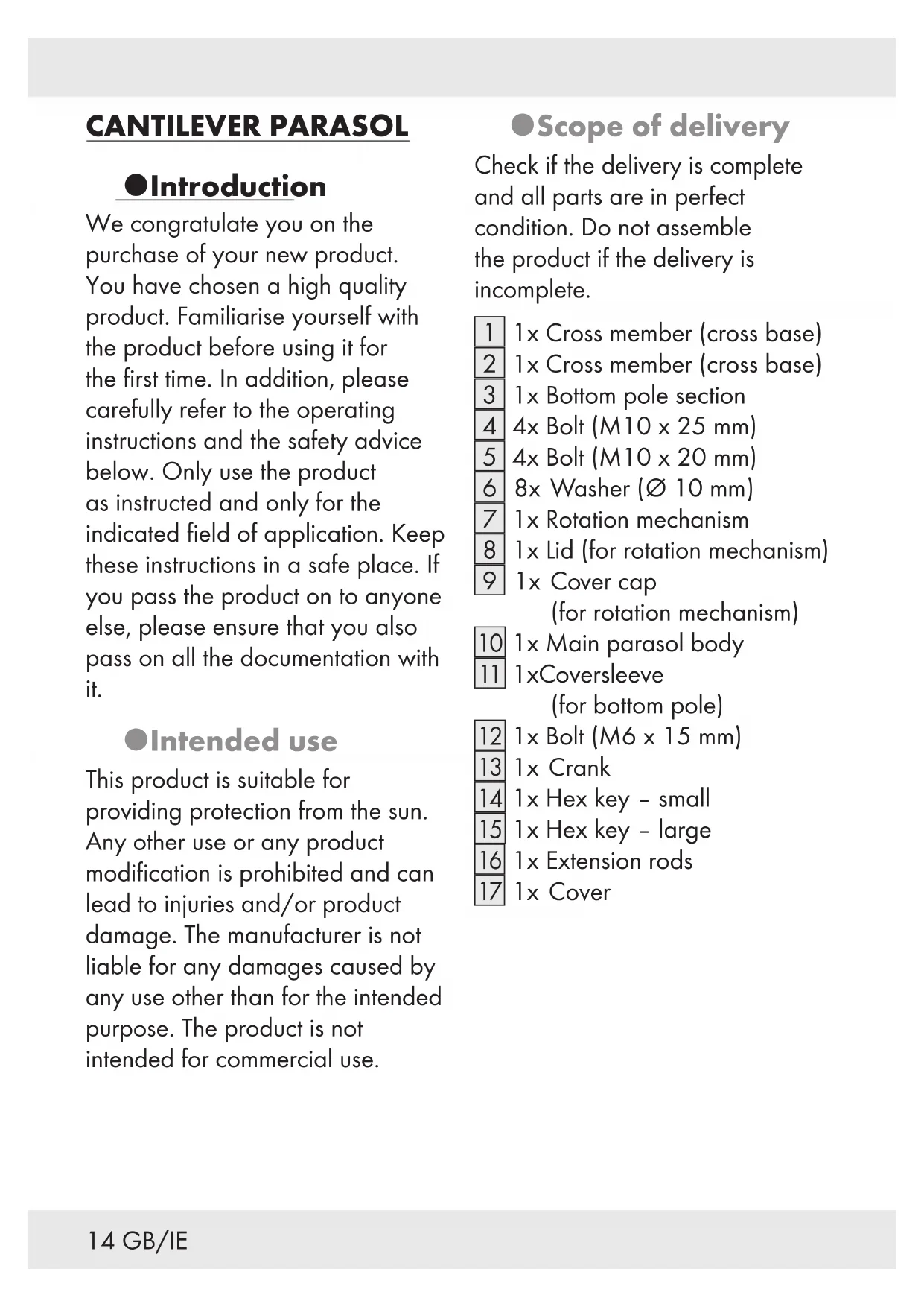 This product is suitable for providing protection from the sun. Any other use or any product modification is prohibited and can lead to injuries and/or product damage. The manufacturer is not liable for any damages caused by any use other than for the intended purpose. The product is not intended for commercial use.