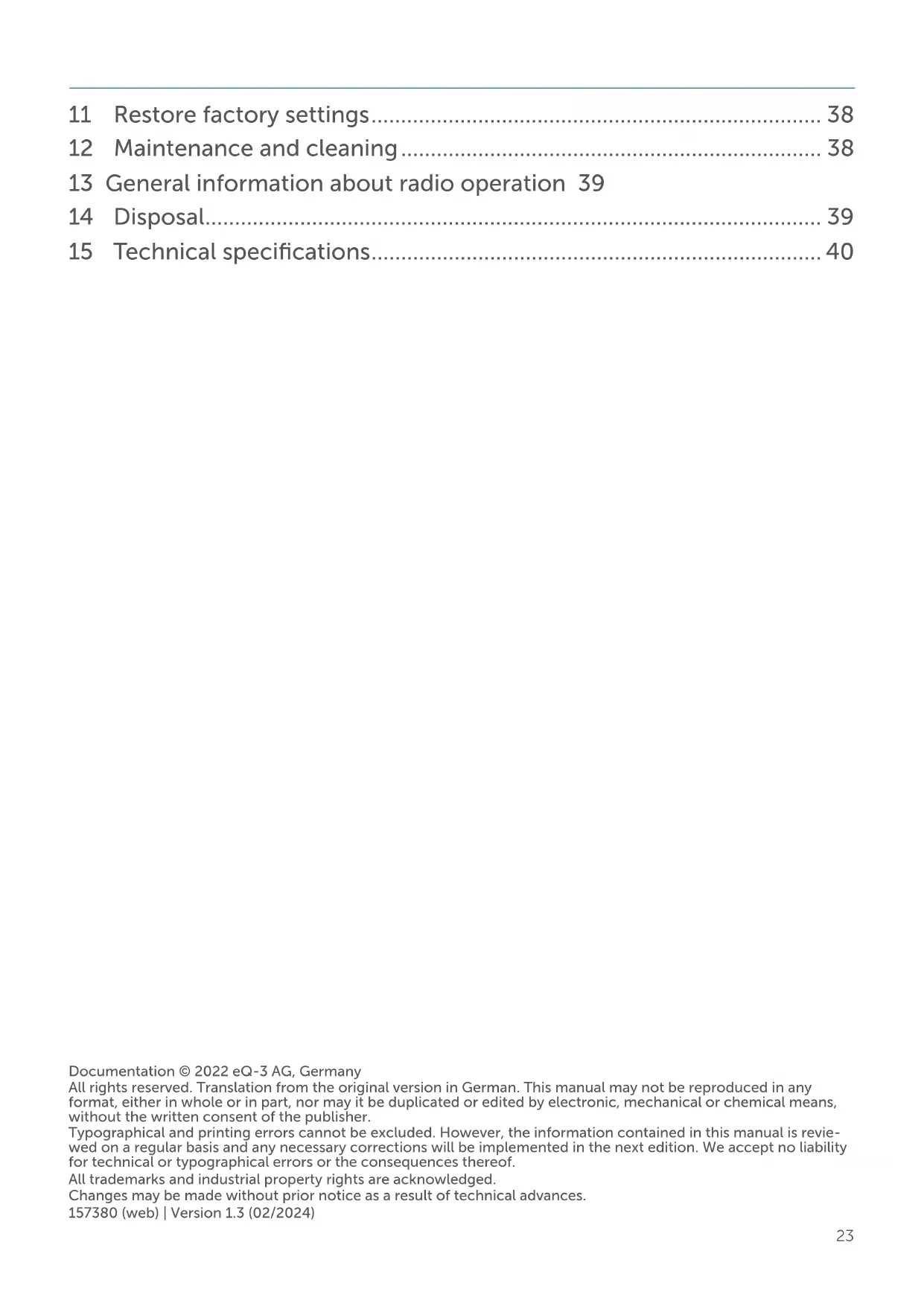 - Documentation © 2022 eQ-3 AG, Germany All rights reserved. Translation from the original version in German. This manual may not be reproduced in any format, either in whole or in part, nor may it be duplicated or edited by electronic, mechanical or chemical means, without the written consent of the publisher. Typographical and printing errors cannot be excluded. However, the information contained in this manual is revie- wed on a regular basis and any necessary corrections will be implemented in the next edition. We accept no liability for technical or typographical errors or the consequences thereof. All trademarks and industrial property rights are acknowledged. Changes may be made without prior notice as a result of technical advances. 157380 (web) | Version 1.3 (02/2024) 11 Restore factory settings p. 38