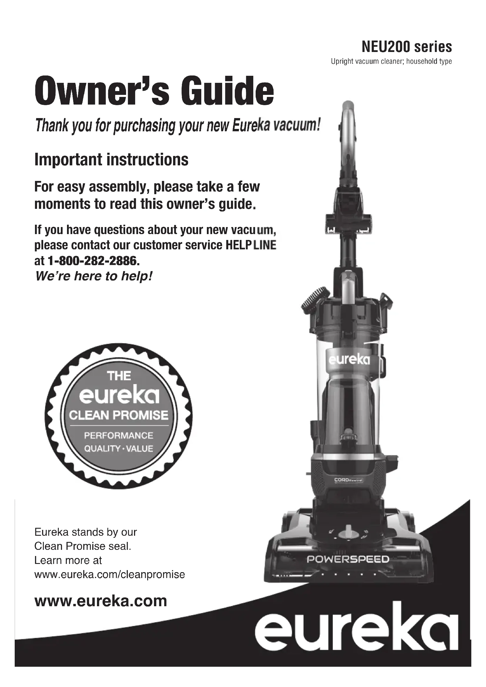 - www.eureka.com 1 Thank you for purchasing your new Eureka vacuum! Important instructions For easy assembly, please take a few moments to read this owner’s guide. If you have questions about your new vacuum, please contact our customer service HELPLINE at 1-800-282-2886. We’re here to help!Eureka stands by our Clean Promise seal. Learn more at www.eureka.com/cleanpromise www.eureka.com Owner’s Guide NEU200 series Upright vacuum cleaner; household type2 Eureka Customer Service HELPLINE 1-800-282-2886 Contents Important safeguards p. 3