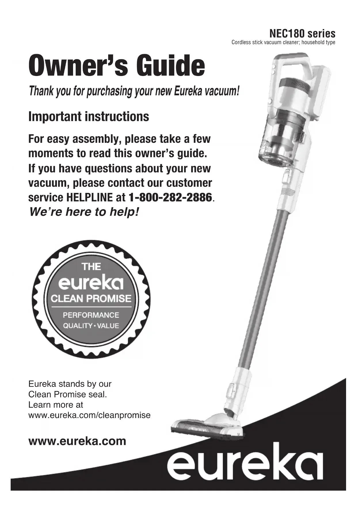 - Thank you for purchasing your new Eureka vacuum! Important instructions For easy assembly, please take a few moments to read this owner’s guide. If you have questions about your new vacuum, please contact our customer service HELPLINE at 1-800-282-2886. We’re here to help! Eureka stands by our Clean Promise seal. Learn more at www.eureka.com/cleanpromise www.eureka.com Owner’s Guide NEC180 series Cordless stick vacuum cleaner; household type2 Contents Important safeguards p. 3