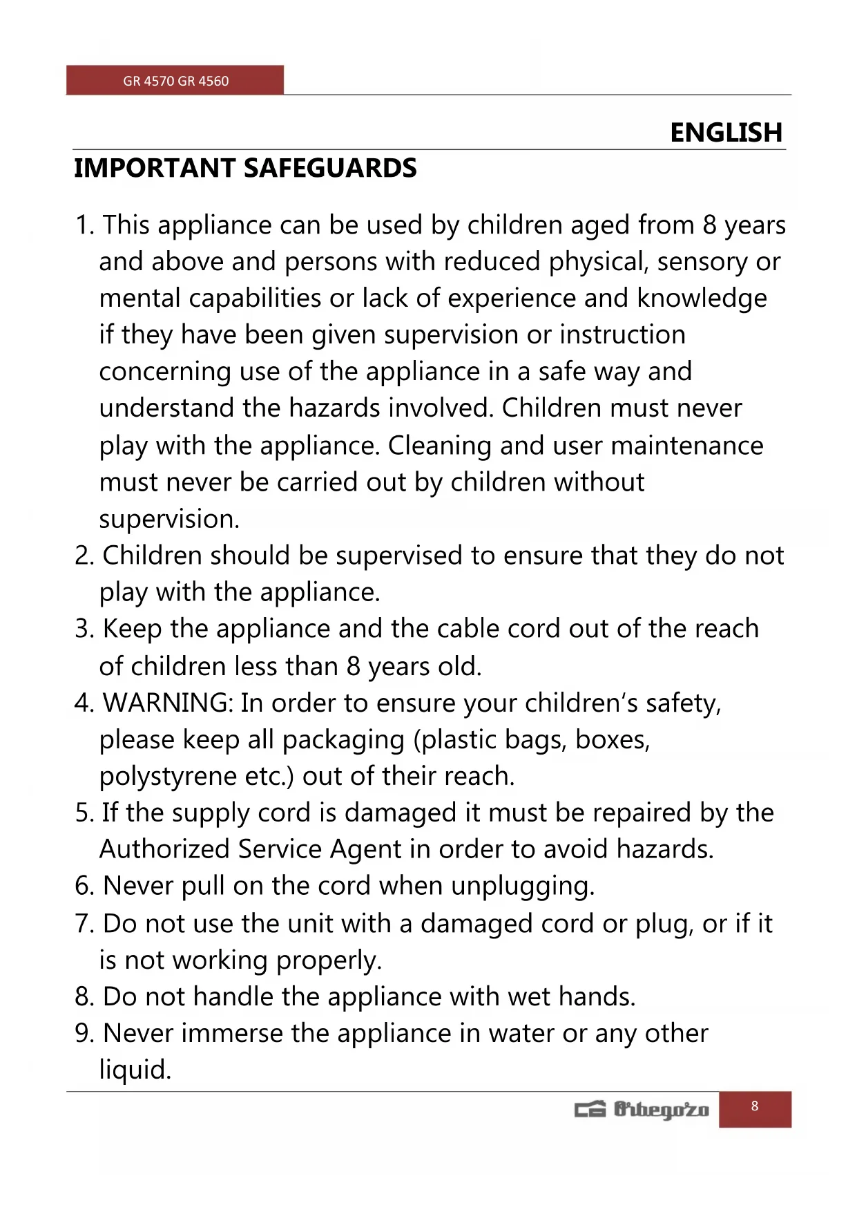 injury. To reduce the risk of electric shock, do not immerse or expose the product or flexible cord to rain, moisture or any liquid other than those necessary for correct operation of the product. This product should not be used in the immediate vicinity of water, such as bathtub, washbowls, swimming pool etc. where the likelihood of immersion or splashing could occur. Ensure the power cord is kept away from the cooking plates of the Grill when in use. Do not leave the appliance unattended when switched on. Switch off and unplug from outlet when not in use, before assembling or disassembling parts and before cleaning. Do not use the appliance for other than its intended use.GR 4570 GR 4560
