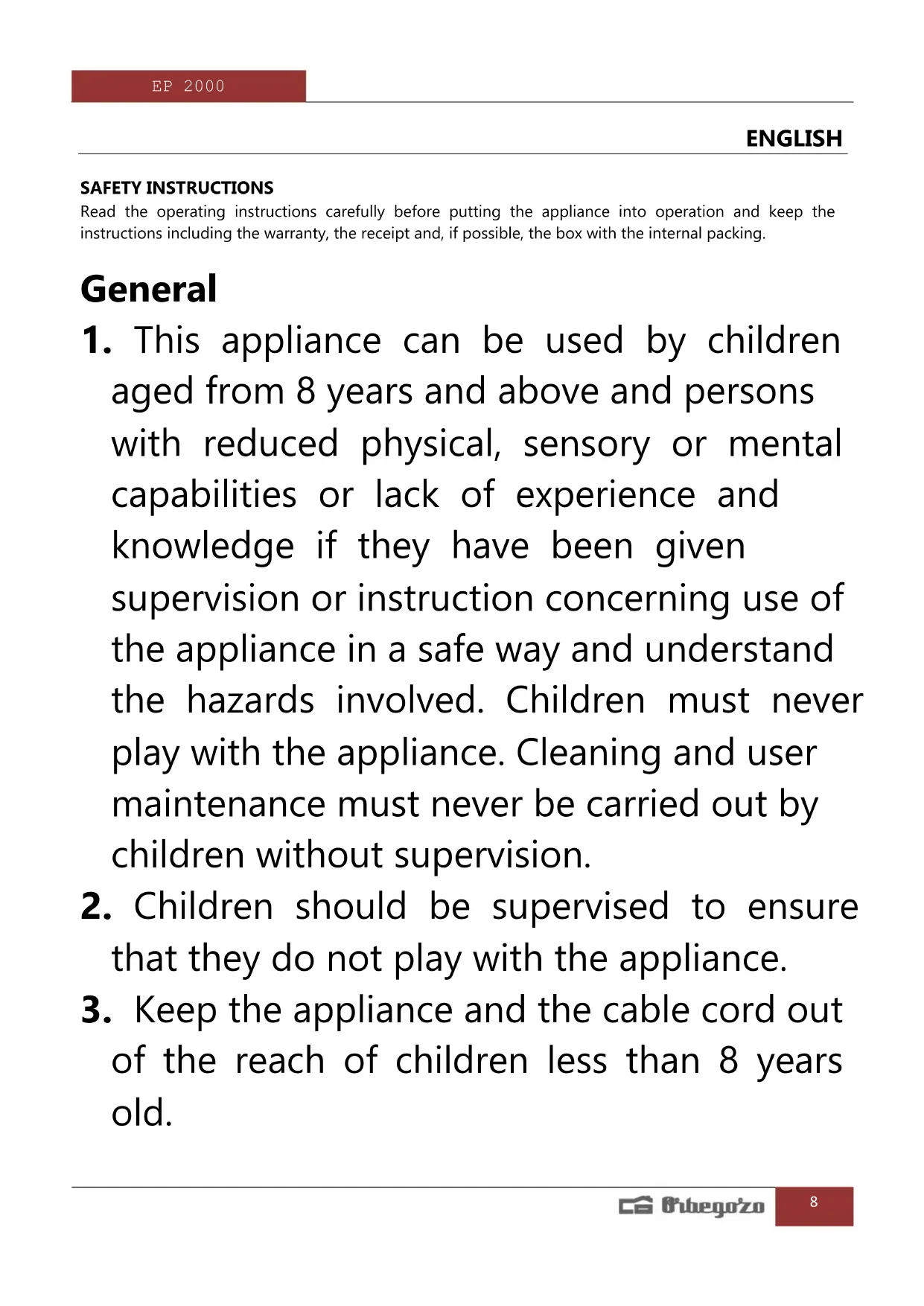 USER MANUAL EP 2000 Orbegozo