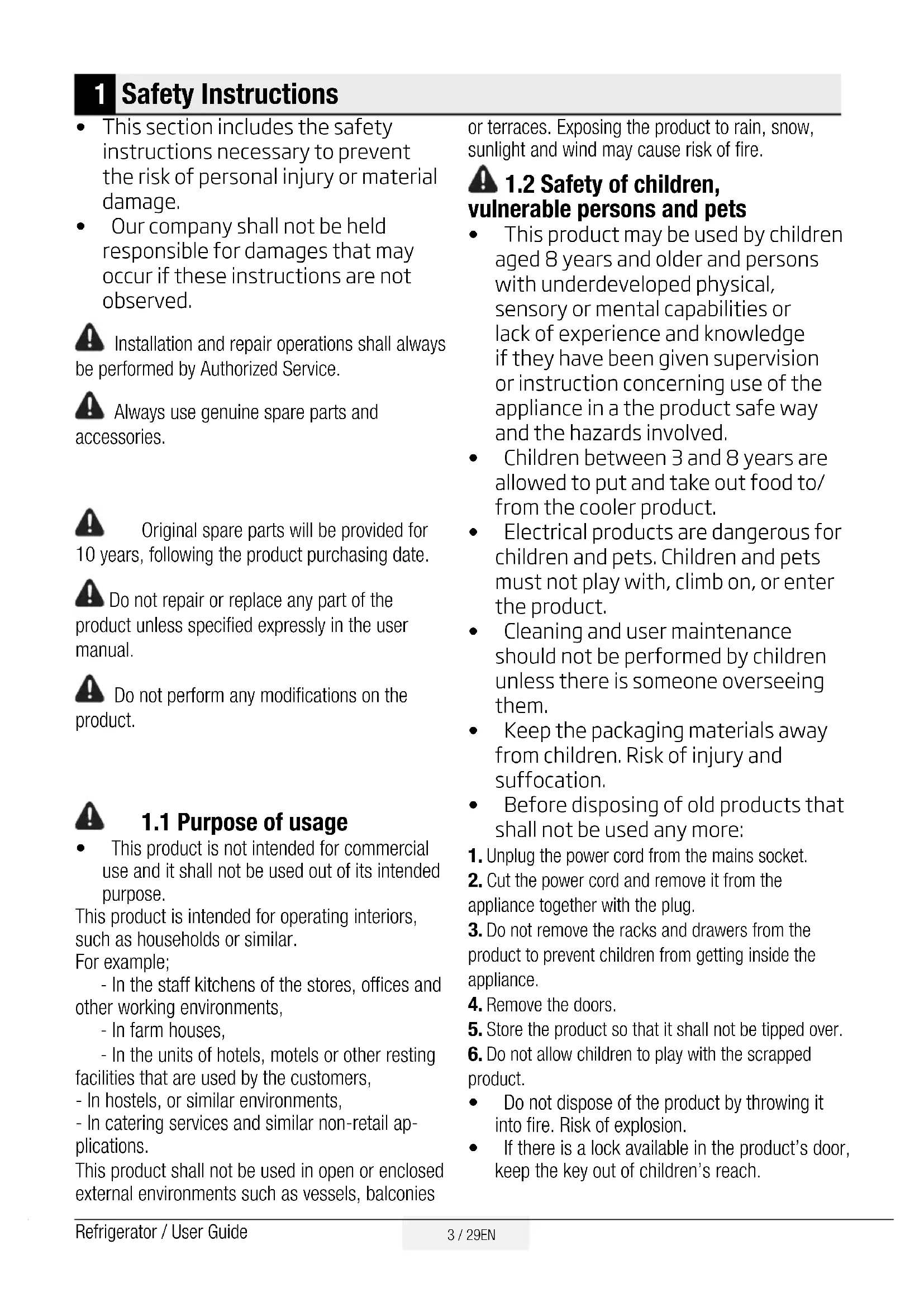 Children between 3 and 8 years are allowed to put and take out food to/ from the cooler product. - Electrical products are dangerous for children and pets. Children and pets must not play with, climb on, or enter the product.