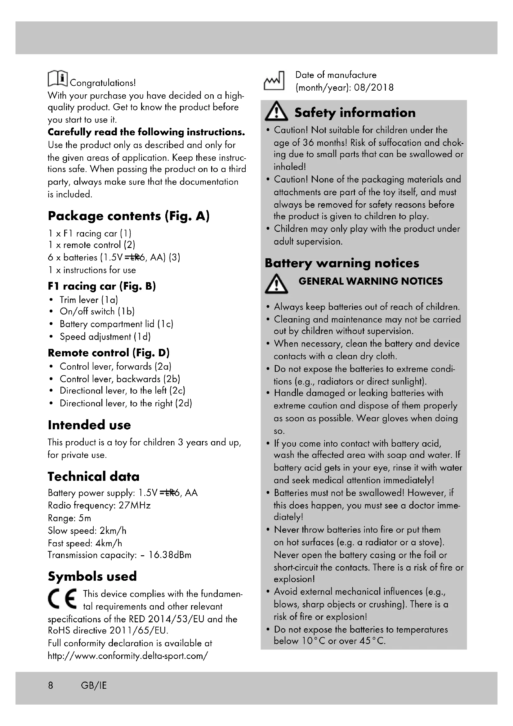 - Directional lever, to the right (2d) Intended use This product is a toy for children 3 years and up, for private use. Technical data Battery power supply: 1.5V LR6, AA Radio frequency: 27MHz Range: 5m Slow speed: 2km/h Fast speed: 4km/h Transmission capacity: – 16.38dBm Symbols used This device complies with the fundamen- tal requirements and other relevant specifications of the RED 2014/53/EU and the RoHS directive 2011/65/EU. Full conformity declaration is available at http://www.conformity.delta-sport.com/ Date of manufacture (month/year): 08/2018 Safety information