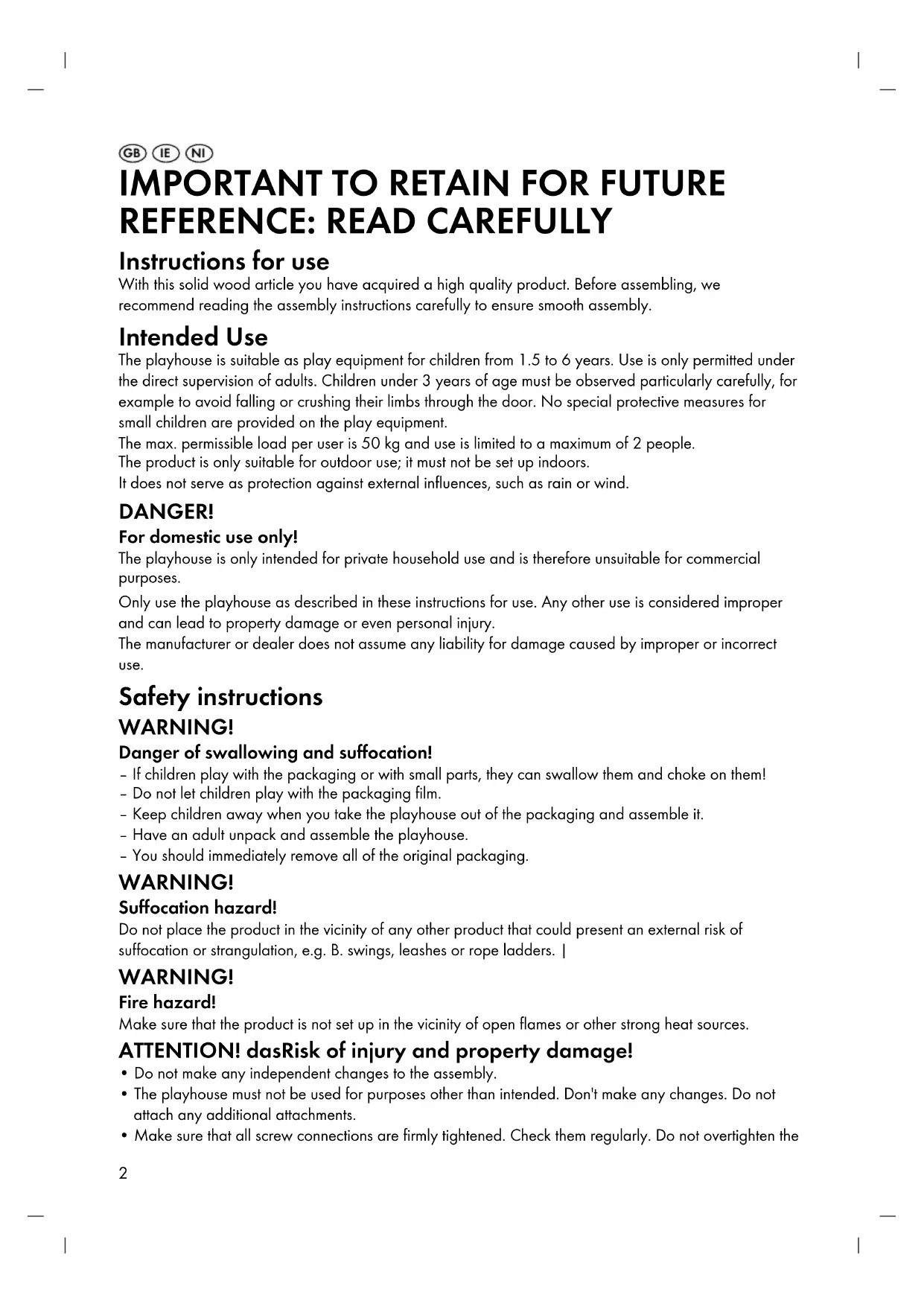 Instructions for use With this solid wood article you have acquired a high quality product. Before assembling, we recommend reading the assembly instructions carefully to ensure smooth assembly. Intended Use The playhouse is suitable as play equipment for children from 1.5 to 6 years. Use is only permitted under the direct supervision of adults. Children under 3 years of age must be observed particularly carefully, for example to avoid falling or crushing their limbs through the door. No special protective measures for small children are provided on the play equipment. The max. permissible load per user is 50 kg and use is limited to a maximum of 2 people. The product is only suitable for outdoor use; it must not be set up indoors. It does not serve as protection against external influences, such as rain or wind. DANGER! For domestic use only! The playhouse is only intended for private household use and is therefore unsuitable for commercial purposes. Only use the playhouse as described in these instructions for use. Any other use is considered improper and can lead to property damage or even personal injury. The manufacturer or dealer does not assume any liability for damage caused by improper or incorrect use. Safety instructions WARNING! Danger of swallowing and suffocation! – If children play with the packaging or with small parts, they can swallow them and choke on them! – Do not let children play with the packaging film. – Keep children away when you take the playhouse out of the packaging and assemble it. – Have an adult unpack and assemble the playhouse. – You should immediately remove all of the original packaging. WARNING! Suffocation hazard! Do not place the product in the vicinity of any other product that could present an external risk of suffocation or strangulation, e.g. B. swings, leashes or rope ladders. | WARNING! Fire hazard! Make sure that the product is not set up in the vicinity of open flames or other strong heat sources. ATTENTION! dasRisk of injury and property damage!