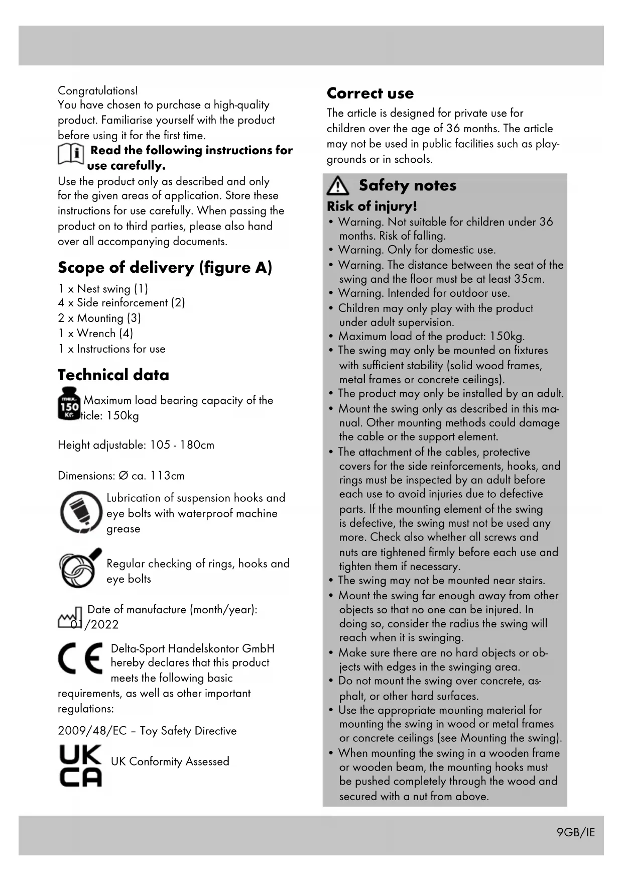 - When mounting the swing in a wooden frame or wooden beam, the mounting hooks must be pushed completely through the wood and secured with a nut from above. Congratulations! You have chosen to purchase a high-quality product. Familiarise yourself with the product before using it for the first time. Read the following instructions for use carefully. Use the product only as described and only for the given areas of application. Store these instructions for use carefully. When passing the product on to third parties, please also hand over all accompanying documents. Scope of delivery (figure A) 1 x Nest swing (1) 4 x Side reinforcement (2) 2 x Mounting (3) 1 x Wrench (4) 1 x Instructions for use Technical data Maximum load bearing capacity of the article: 150kg Height adjustable: 105 - 180cm Dimensions: Ø ca. 113cm Lubrication of suspension hooks and eye bolts with waterproof machine grease Regular checking of rings, hooks and eye bolts Date of manufacture (month/year): 01/2022 Delta-Sport Handelskontor GmbH hereby declares that this product meets the following basic requirements, as well as other important regulations: 2009/48/EC – Toy Safety Directive UK Conformity Assessed10 GB/IE