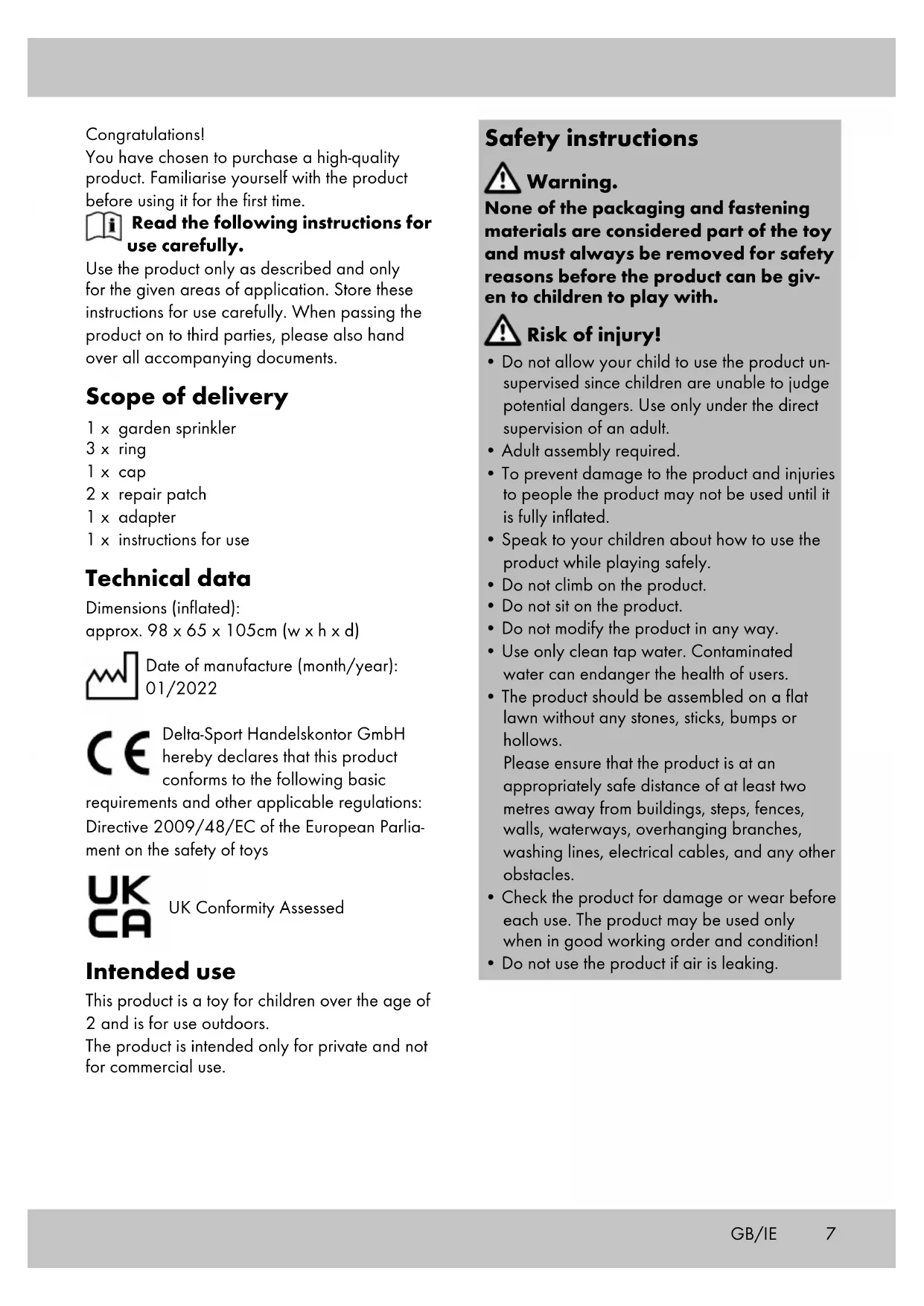Screw the adapter onto the product‘s water connection. Connect a garden hose using a suitable hose coupling (not supplied) and attach this to the water connection with the product’s adapter (fig. D). Emptying the product To do so, open the seal of the water chambers and let the water run out (fig. A). GB/IE9 Disassembly Allow the product to dry completely before folding it up. Remove the garden hose. Deflate the product as follows: