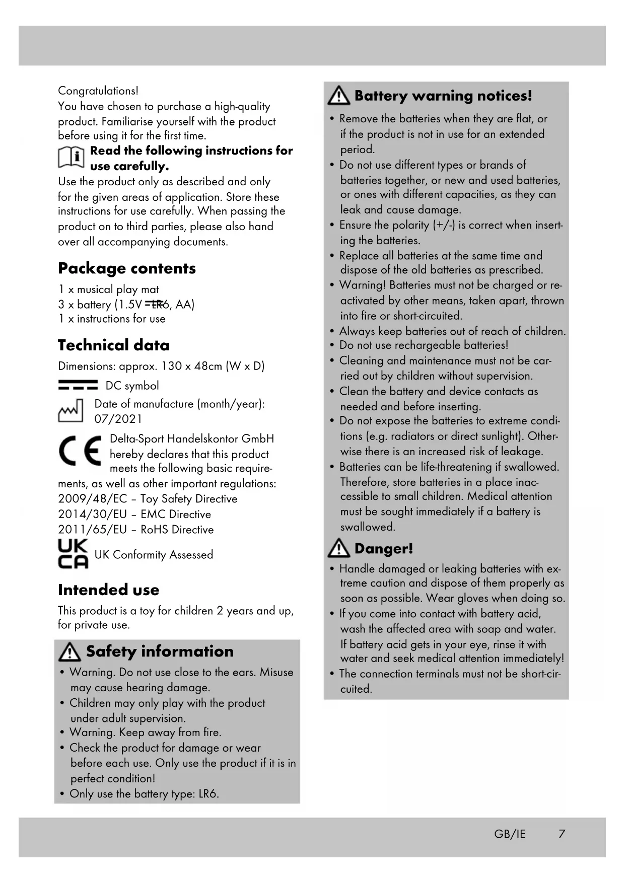 - While it is replaying, press on another instru- ment to play the recording on that instrument. GB/IE9GB/IE Storage, cleaning When not in use, always store the product dry, clean, without batteries and at room tempera- ture. Only clean the product with a damp cloth and wipe dry afterwards. IMPORTANT! Never clean the product with harsh cleaning agents. Disposal In the interest of protecting the environ- ment, do not throw your product into the household waste once you are finished with it, but rather take it to a specialty disposal facility. Find out about collection sites and their hours of operation from your local authority. Defective or used batteries must be recycled pursuant to Directive 2006/66/EC and changes to it. Return batteries and/or the product via the collecting sites provided. Packaging materials, such as plastic bags, must be kept away from children. Keep the packaging materials out of reach of children. Environmental damage caused by improper disposal of batteries! Batteries may not be disposed of with household waste. They may contain toxic heavy metals and are subject to hazardous waste treatment. The chemical symbols of the heavy metals are as follows: Cd = cadmium, Hg = mercury, Pb = lead. Dispose of used batter- ies at a municipal collection site. Dispose of the product and packaging in an environmentally friendly manner. Note the label on the packaging materials when separating waste, as these are labelled with abbreviations (a) and numbers (b) with the following meaning: 1–7: plastics/20–22: paper and card- board/80–98: composite materials. The product and the packaging materials can be recycled, dispose of them separately for better treatment of waste. The Triman logo only applies to France. Find out how to dispose of the used product from your municipal or city administration. Notes on the guarantee and service handling The product was produced with great care and under continuous quality control. DELTA-SPORT HANDELSKONTOR GmbH gives private end customers a three-year guarantee on this product from the date of purchase (guarantee period) in accordance with the following provisions. The guarantee is only valid for material and manufacturing defects. The guarantee does not cover parts subject to normal wear and tear that are thus considered wear parts (e.g. batteries) or fragile parts such as switches, rechargeable batteries, or parts made of glass. Claims under this guarantee are excluded if the product has been used incorrectly, improperly, or contrary to the intended purpose, or if the provi- sions in the instructions for use were not observed, unless the end customer proves that a material or manufacturing defect exists that was not caused by one of the aforementioned circumstances. Claims under the guarantee can only be made within the guarantee period by presenting the original sales receipt. Please therefore keep the original sales receipt. The guarantee period is not extended by any repairs carried out under the guarantee, under statutory guarantees, or as a gesture of goodwill. This also applies to replaced and repaired parts. If you wish to make a claim please first contact the service hotline mentioned below or contact us by e-mail. If there is a guarantee case, then the product will be repaired or replaced free of charge to you or the purchase price will be refunded, depending on our choice. Your legal rights, in particular guarantee claims against the respective seller, are not limited by this guarantee. IAN: 366944_2101 Service Great Britain Tel.: 0800 404 7657 E-Mail: deltasport@lidl.co.uk Service Ireland Tel.: 1890 930 034 (0,08 EUR/Min., (peak)) (0,06 EUR/Min., (off peak)) E-Mail: deltasport@lidl.ie10 FR/BE Félicitations ! Vous venez d’acquérir un article de grande qualité. Avant la première utilisation, familiari- sez-vous avec l’article. Pour cela, veuillez lire attentive- ment la notice d’utilisation suivante. Utilisez l’article uniquement comme indiqué et pour les domaines d’utilisation mentionnés. Conservez bien cette notice d’utilisation. Si vous cédez l’article à un tiers, veillez à lui remettre l’ensemble de la documentation. Étendue de la livraison 1 tapis musical 3 piles (1,5 V LR6, AA) 1 notice d’utilisation Caractéristiques techniques Dimensions : env. 130 x 48 cm (l x p) Symbole de tension continue Date de fabrication (mois/année) : 07/2021 Delta-Sport Handelskontor GmbH déclare par la présente que cet article répond aux exigences essentielles et aux autres dispositions en vigueur suivantes : 2009/48/CE – Directive relative à la sécurité des jouets 2014/30/UE – Directive européenne CEM 2011/65/UE – Directive RoHS Utilisation conforme à sa destination Cet article est un jouet pour enfants de plus de 2 ans destiné à une utilisation privée. Consignes de sécurité