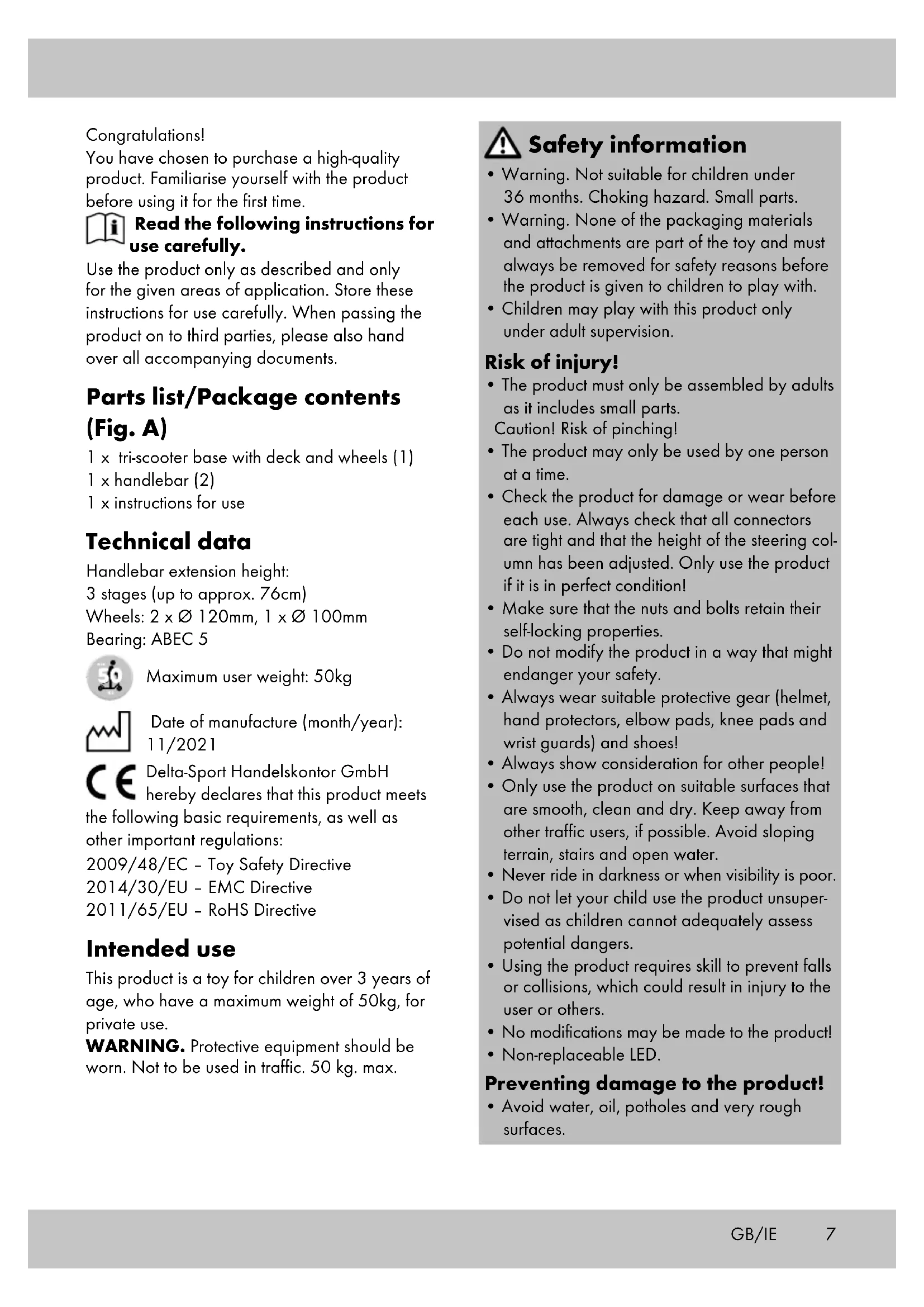 the screws. After replacing the wheels: After the first few minutes of riding, make sure that the screws are still tight and that nothing has detached or become loose. Tension the wheel once more to make sure that it runs smoothly. Storage, cleaning We recommend that you clean and dry the product thoroughly after use. Remove small stones or other objects that may have become stuck to the wheels. Always store the product in a dry place. Disposal In the interest of protecting the environ- ment, do not throw your product into the household waste once you are finished with it, but rather take it to a specialty disposal facility. Find out about collection sites and their hours of operation from your local authority. Defective or used batteries must be recycled pursuant to Directive 2006/66/EC and changes to it. Return batteries and/or the product via the collecting sites provided. GB/IE9GB/IE The guarantee period is not extended by any repairs carried out under the guarantee, under statutory guarantees, or as a gesture of good- will. This also applies to replaced and repaired parts. If you wish to make a claim please first contact the service hotline mentioned below or contact us by e-mail. If there is a guarantee case, then the product will be repaired or replaced free of charge to you or the purchase price will be refunded, depending on our choice. Your legal rights, in particular guarantee claims against the respective seller, are not limited by this guarantee. IAN: 374104_2104 Service Great Britain Tel.: 0800 404 7657 E-Mail: deltasport@lidl.co.uk Service Ireland Tel.: 1890 930 034 (0,08 EUR/Min., (peak)) (0,06 EUR/Min., (off peak)) E-Mail: deltasport@lidl.ie Packaging materials, such as plastic bags, must be kept away from children. Keep the packaging materials out of reach of children. Dispose of the product and packaging in an environmentally friendly manner. Note the label on the packaging materials when separating waste, as these are labelled with abbreviations (a) and numbers (b) with the following meaning: 1–7: plastics/20–22: paper and card- board/80–98: composite materials. The product and the packaging materials can be recycled, dispose of them separately for better treatment of waste. The Triman logo only applies to France. Find out how to dispose of the used product from your municipal or city administration. Notes on the guarantee and service handling The product was produced with great care and under continuous quality control. DELTA-SPORT HANDELSKONTOR GmbH gives private end customers a three-year guarantee on this product from the date of purchase (guarantee period) in accordance with the following provisions. The guarantee is only valid for material and manufacturing defects. The guarantee does not cover parts subject to normal wear and tear that are thus considered wear parts (e.g. batteries) or fragile parts such as switches, rechargeable batteries, or parts made of glass. Claims under this guarantee are excluded if the product has been used incorrectly, improperly, or contrary to the intended purpose, or if the provisions in the instructions for use were not observed, unless the end customer proves that a material or manufacturing defect exists that was not caused by one of the aforementioned circumstances. Claims under the guarantee can only be made within the guarantee period by presenting the original sales receipt. Please therefore keep the original sales receipt.10 Félicitations ! Vous venez d’acquérir un article de grande qualité. Avant la première utilisation, familiari- sez-vous avec l’article. Pour cela, veuillez lire attentive- ment la notice d’utilisation suivante. Utilisez l’article uniquement comme indiqué et pour les domaines d’utilisation mentionnés. Conservez bien cette notice d’utilisation. Si vous cédez l’article à un tiers, veillez à lui remettre l’ensemble de la documentation. Désignation des pièces/ étendue de la livraison (fig. A) 1 partie inférieure du Tri-Scooter avec plateau et roues (1) 1 poignée du guidon (2) 1 notice d’utilisation Caractéristiques techniques Hauteur de rallonge du guidon : 3 niveaux (jusqu’à env. 76 cm) Roues : 2 x Ø 120 mm, 1 x Ø 100 mm Roulement : ABEC 5 Poids maximal de l’utilisateur : 50 kg Date de fabrication (mois/année) : 11/2021 Delta-Sport Handelskontor GmbH déclare par la présente que cet article répond aux exigences essentielles et aux autres dispositions en vigueur suivantes : 2009/48/CE – Directive relative à la sécurité des jouets 2014/30/UE – Directive européenne CEM 2011/65/UE – Directive RoHS Utilisation conforme à sa destination Cet article est un jouet pour enfants de plus de 3 ans avec un poids maximum d’utilisation de 50 kg pour un usage privé. ATTENTION. À utiliser avec équipement de protection. Ne pas utiliser sur la voie publique. 50 kg max. Consignes de sécurité