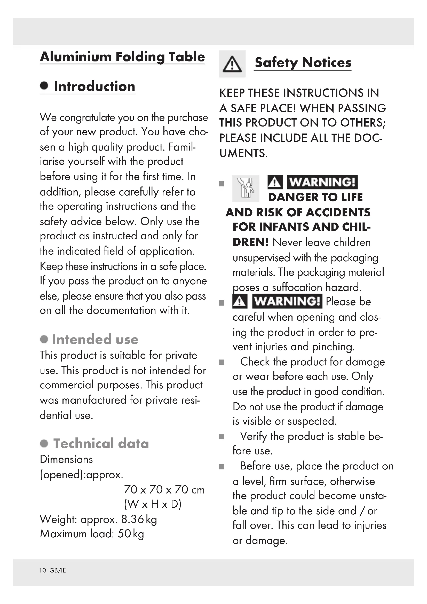 DREN! Never leave children unsupervised with the packaging materials. The packaging material poses a suffocation hazard. Please be careful when opening and clos- ing the product in order to pre- vent injuries and pinching. Check the product for damage or wear before each use. Only use the product in good condition. Do not use the product if damage is visible or suspected. Verify the product is stable be- fore use. Before use, place the product on a level, firm surface, otherwise the product could become unsta- ble and tip to the side and / or fall over. This can lead to injuries or damage.11 GB/IE 50 kg Observe the maximum load capacity of 50 kg. If the weight limit is exceeded, this can lead to product damage and / or injuries. Please ensure that persons, es- pecially children, do not stand on the product or pull themselves up on it. The product could fall over. Do not sit or stand on the product Keep your hands out of the fold- ing mechanism in order to avoid the risk of injury. Ensure that the folding function is correctly locked in place be- fore using the product. Ensure that the product has been fully opened before using it. This product is not a toy and should be used under adult su- pervision. The product is not a climbing frame or a toy! Secure the product in extreme weather, e.g. strong wind. Do not use the product close to a naked flame.