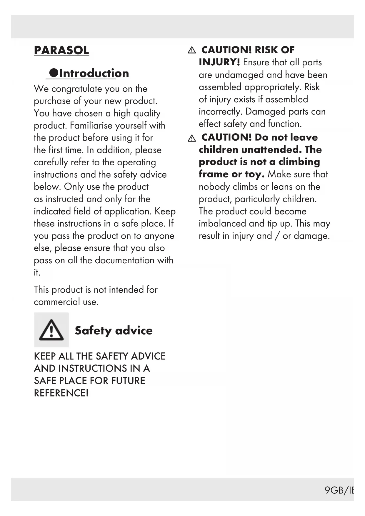 CAUTION! Do not leave children unattended. The product is not a climbing frame or toy. Make sure that nobody climbs or leans on the product, particularly children. The product could become imbalanced and tip up. This may result in injury and / or damage.10 GB/IE
