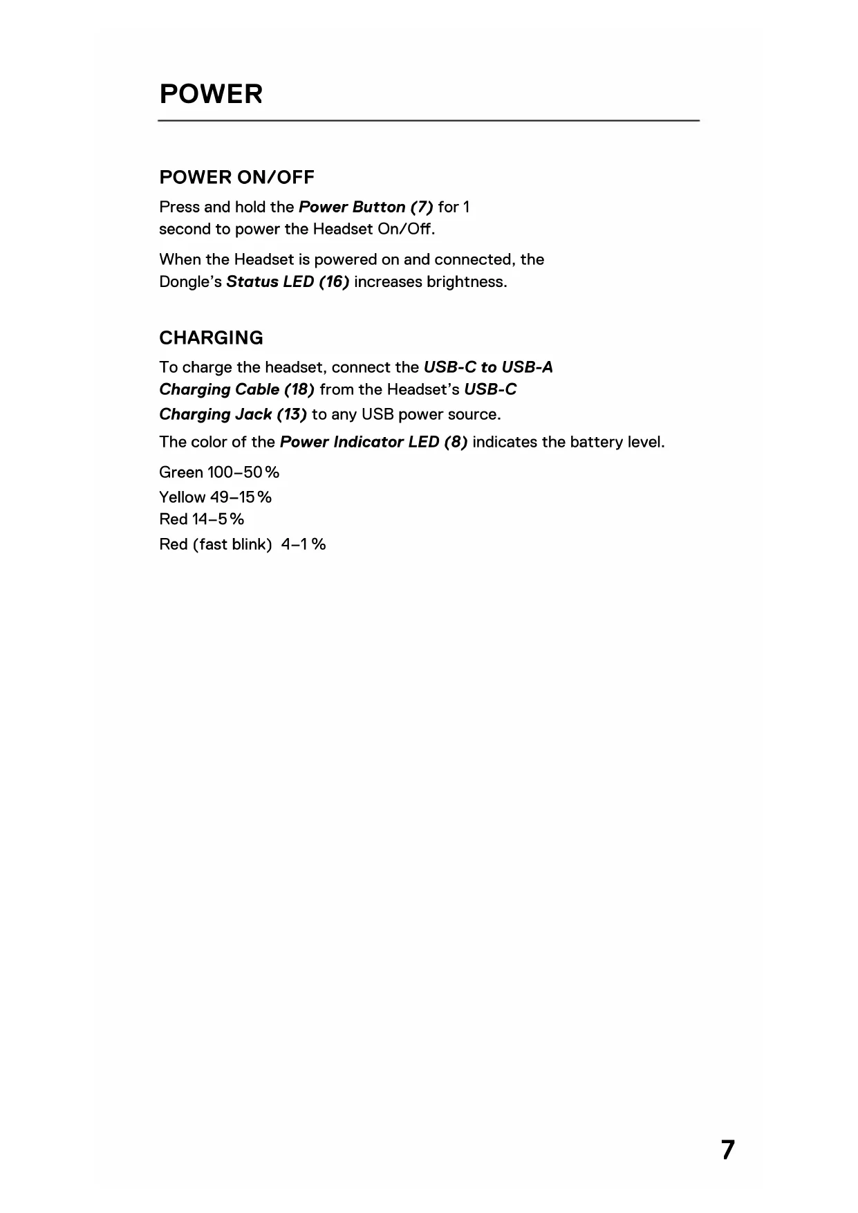 Press and hold the Power Button (7) for 1 second to power the Headset On/O. When the Headset is powered on and connected, the Dongle’s Status LED (16) increases brightness. CHARGING To charge the headset, connect the USB-C to USB-A Charging Cable (18) from the Headset’s USB-C Charging Jack (13) to any USB power source. The color of the Power Indicator LED (8) indicates the battery level. Green 100–50 % Yellow 49–15 % Red 14–5 % Red (fast blink) 4–1 %8 PAIRING Note: The headset and dongle come paired. If you need to re-pair: 1 Connect the USB-C Multi-Platform Dongle (14) to your gaming device. 2 Press and hold the Dongle’s Pairing Button (15) for 4 seconds until the Power Indicator LED (8) blinks rapidly. 3 With the headset o, press and hold the Power Button (7) for 4 seconds until the Power Indicator LED (8) blinks rapidly. 4 When pairing is successful you will hear a tone, and the Dongle’s Status LED (16) will turn solid.9 BLUETOOTH BLUETOOTH POWER Bluetooth can be powered On / O independently of the 2.4 GHz wireless by pressing and holding the Bluetooth Button (9) for 1 second. PAIRING With Bluetooth O, press and hold the Bluetooth Button (9) for 4 seconds. MULTIMEDIA CONTROL Answer/End Voice Call Single press the Bluetooth Button (9) Play/Pause Music Single press the Bluetooth Button (9) Skip Track Double press the Bluetooth Button (9) Previous Track Triple press the Bluetooth Button (9) Note: The Power Button (7) can be used for Multimedia control in the same way.