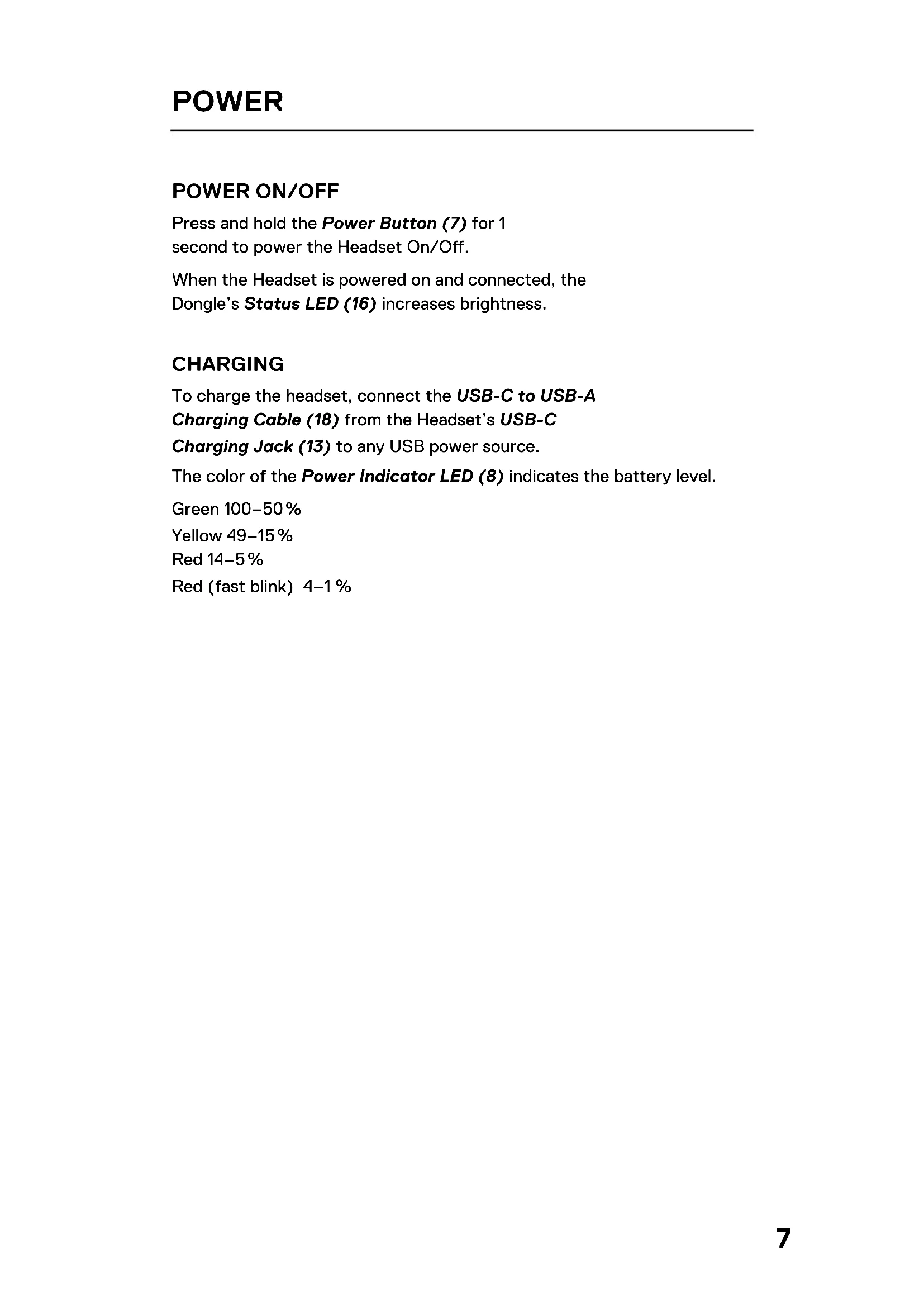 Press and hold the Power Button (7) for 1 second to power the Headset On/O. When the Headset is powered on and connected, the Dongle’s Status LED (16) increases brightness. CHARGING To charge the headset, connect the USB-C to USB-A Charging Cable (18) from the Headset’s USB-C Charging Jack (13) to any USB power source. The color of the Power Indicator LED (8) indicates the battery level. Green 100–50 % Yellow 49–15 % Red 14–5 % Red (fast blink) 4–1 %8 PAIRING Note: The headset and dongle come paired. If you need to re-pair: 1 Connect the USB-C Multi-Platform Dongle (14) to your gaming device. 2 Press and hold the Dongle’s Pairing Button (15) for 4 seconds until the Power Indicator LED (8) blinks rapidly. 3 With the headset o, press and hold the Power Button (7) for 4 seconds until thePower Indicator LED (8) blinks rapidly. 4 When pairing is successful you will hear a tone, and the Dongle’s Status LED (16) will turn solid.9 BLUETOOTH BLUETOOTH POWER Bluetooth can be powered On / O independently of the 2.4 GHz wireless by pressing and holding the Bluetooth Button (9) for 1 second. PAIRING With Bluetooth O, press and hold the Bluetooth Button (9) for 4 seconds. MULTIMEDIA CONTROL Answer/End Voice Call Single press the Bluetooth Button (9) Play/Pause Music Single press the Bluetooth Button (9) Skip Track Double press the Bluetooth Button (9) Previous Track Triple press the Bluetooth Button (9) Note: The Power Button (7) can be used for Multimedia control in the same way.