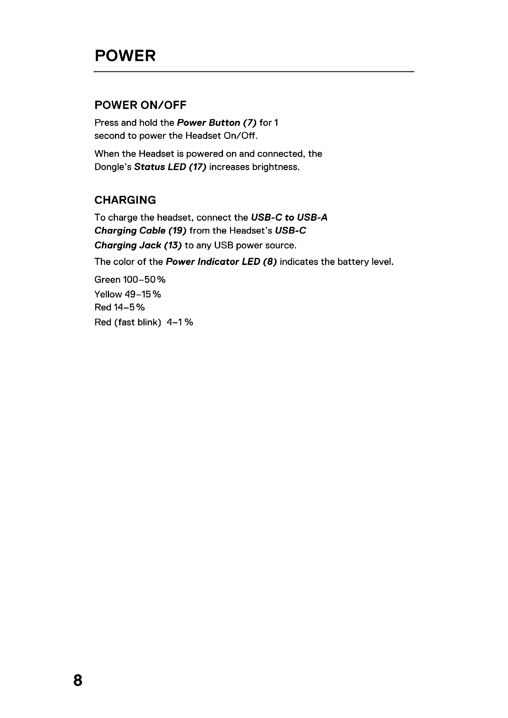 Press and hold the Power Button (7) for 1 second to power the Headset On/O. When the Headset is powered on and connected, the Dongle’s Status LED (17) increases brightness. CHARGING To charge the headset, connect the USB-C to USB-A Charging Cable (19) from the Headset’s USB-C Charging Jack (13) to any USB power source. The color of the Power Indicator LED (8) indicates the battery level. Green 100–50 % Yellow 49–15 % Red 14–5 % Red (fast blink) 4–1 %9 PAIRING Note: The headset and dongle come paired. If you need to re-pair: 1 Connect the USB-C Multi-Platform Dongle (14) to your gaming device. 2 Press and hold the Dongle’s Pairing Button (16) for 4 seconds until the Power Indicator LED (8) blinks rapidly. 3 With the headset o, press and hold the Power Button (7) for 4 seconds until the Power Indicator LED (8) blinks rapidly. 4 When pairing is successful you will hear a tone, and the Dongle’s Status LED (17) will turn solid.10 BLUETOOTH BLUETOOTH POWER Bluetooth can be powered On / O independently of the 2.4 GHz wireless by pressing and holding the Bluetooth Button (9) for 1 second. PAIRING With Bluetooth O, press and hold the Bluetooth Button (9) for 4 seconds. MULTIMEDIA CONTROL Answer/End Voice Call Single press the Bluetooth Button (9) Play/Pause Music Single press the Bluetooth Button (9) Skip Track Double press the Bluetooth Button (9) Previous Track Triple press the Bluetooth Button (9) Note: The Power Button (7) can be used for Multimedia control in the same way.