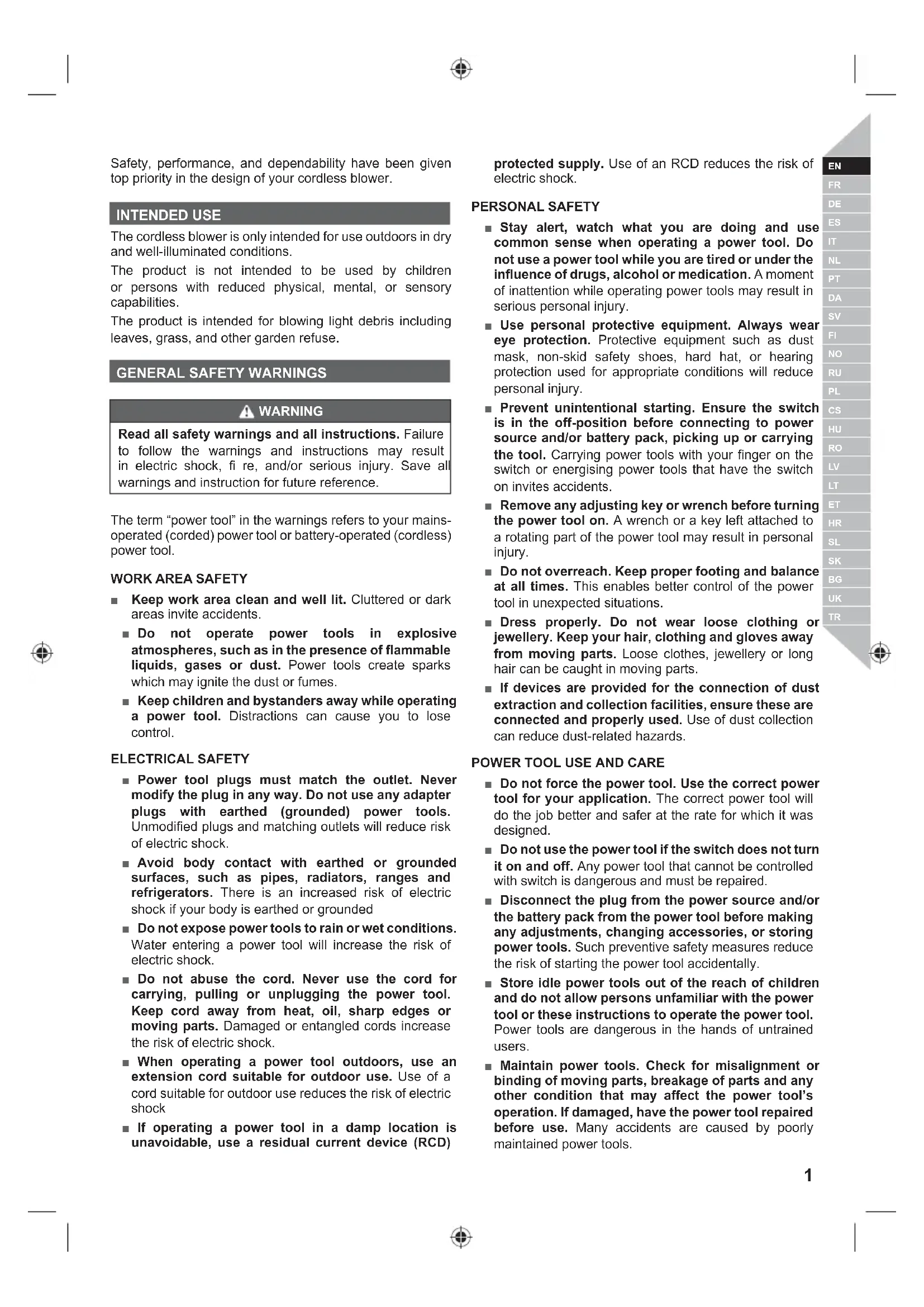 Safety, performance, and dependability have been given top priority in the design of your cordless blower. INTENDED USE The cordless blower is only intended for use outdoors in dry and well-illuminated conditions. The product is not intended to be used by children or persons with reduced physical, mental, or sensory capabilities. The product is intended for blowing light debris including leaves, grass, and other garden refuse.
