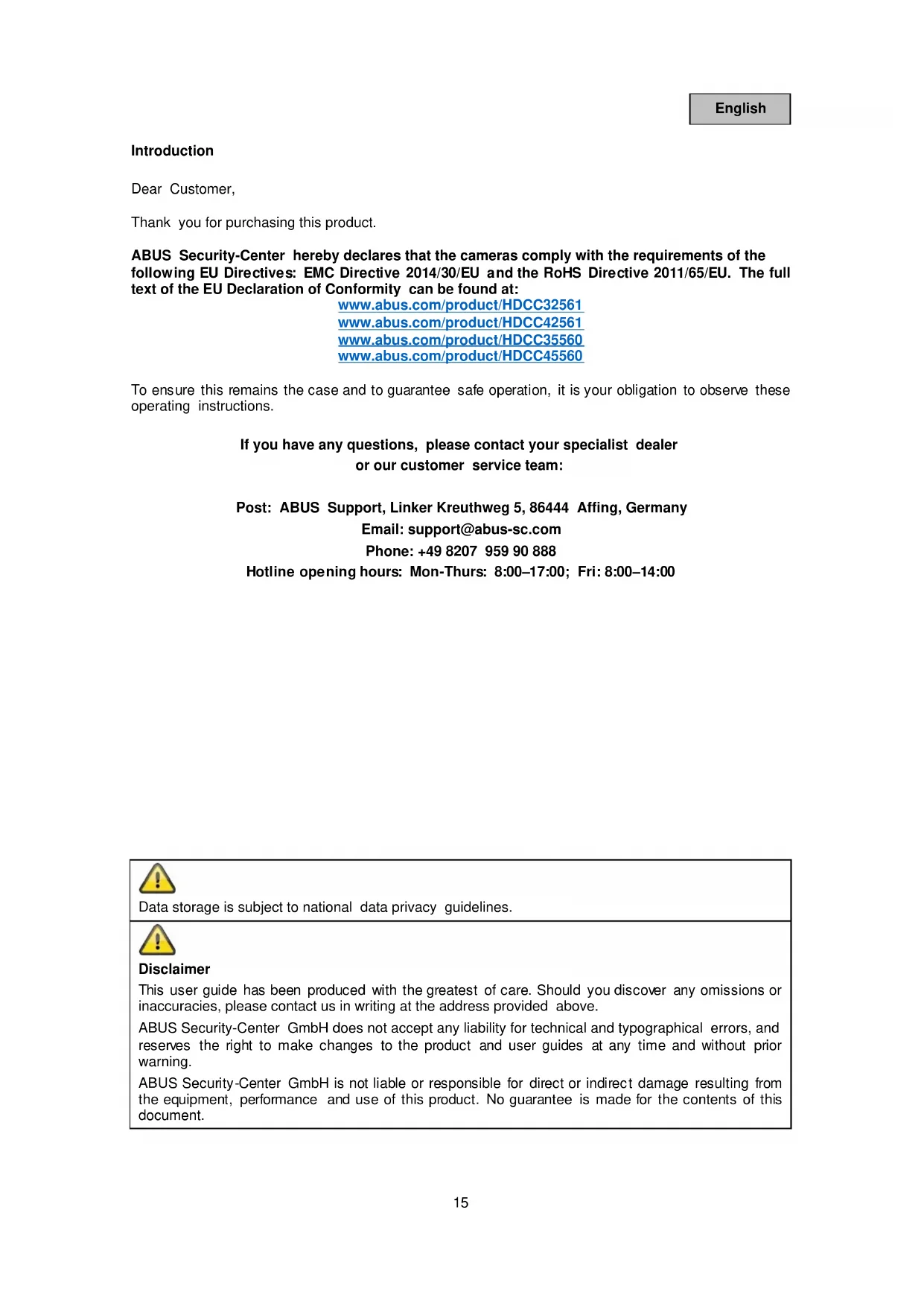 Disclaimer This user guide has been produced with the greatest of care. Should you discover any omissions or inaccuracies, please contact us in writing at the address provided above. ABUS Security-Center GmbH does not accept any liability for technical and typographical errors, and reserves the right to make changes to the product and user guides at any time and without prior warning. ABUS Security-Center GmbH is not liable or responsible for direct or indirect damage resulting from the equipment, performance and use of this product. No guarantee is made for the contents of this document.16 English Explanation of symbols