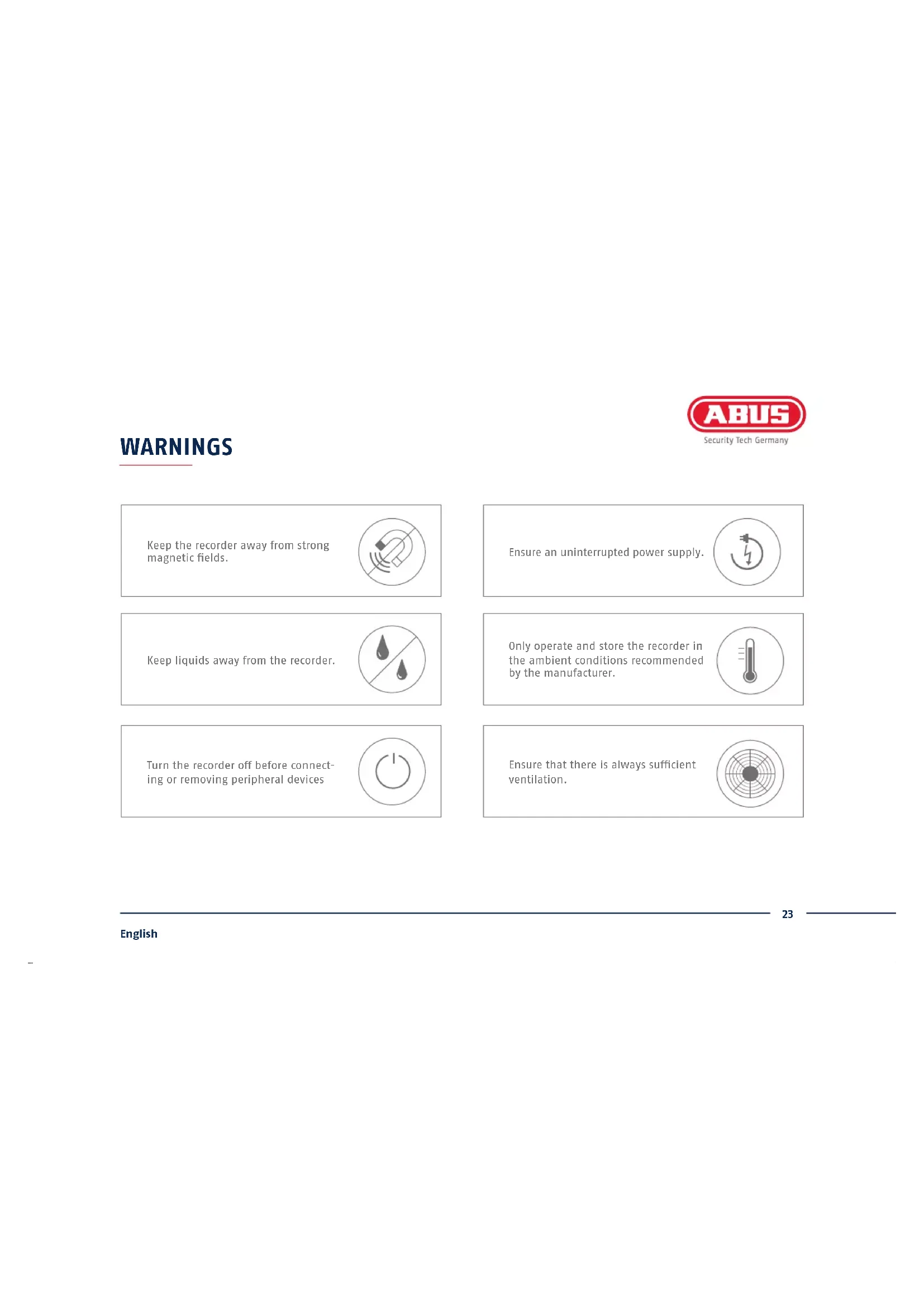ANALOGUE HD RECORDER This quick-start guide describes the initial installation steps for your analogue HD recorder. Detailed information can be found in the user guide on the website www.abus.com21 English Dear Customer, Thank you for purchasing one of our products. This product complies with current domestic and European regulations. Conformity has been proven, and all related certications are available from the manufacturer on request: ABUS Security Center GmbH & Co. KG, Linker Kreuthweg 5, 86444 Ang, GERMANY. To ensure that this standard is maintained and that safe operation is guaranteed, you are obliged to observe the stipulations set out in this user guide. Read the entire user manual before putting the product into operation, and pay attention to all operating instructions and safety information. All company names and product descriptions are trademarks of the corresponding owner. All rights reserved. If you have any questions, please contact your specialist dealer.22 English