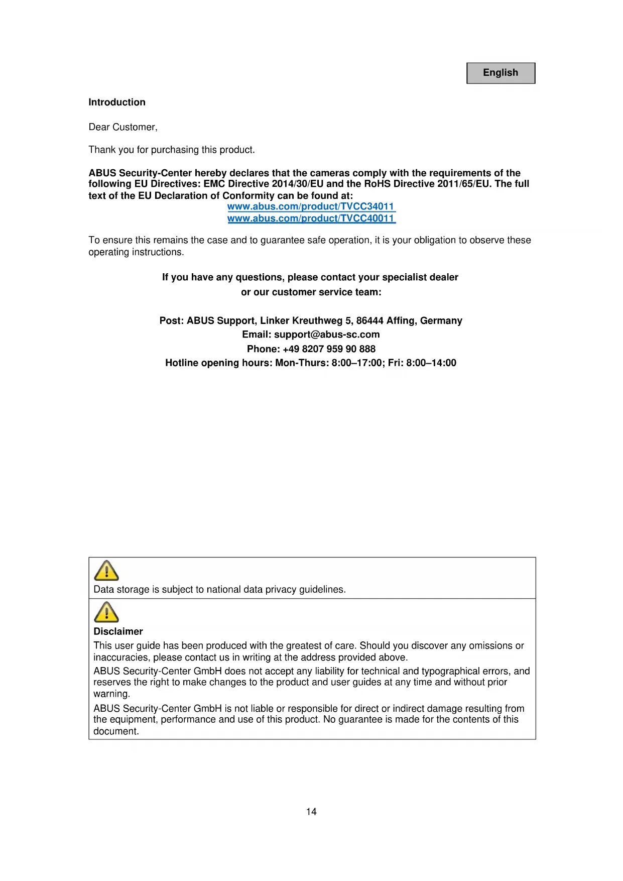 Disclaimer This user guide has been produced with the greatest of care. Should you discover any omissions or inaccuracies, please contact us in writing at the address provided above. ABUS Security-Center GmbH does not accept any liability for technical and typographical errors, and reserves the right to make changes to the product and user guides at any time and without prior warning. ABUS Security-Center GmbH is not liable or responsible for direct or indirect damage resulting from the equipment, performance and use of this product. No guarantee is made for the contents of this document.15 English Explanation of symbols