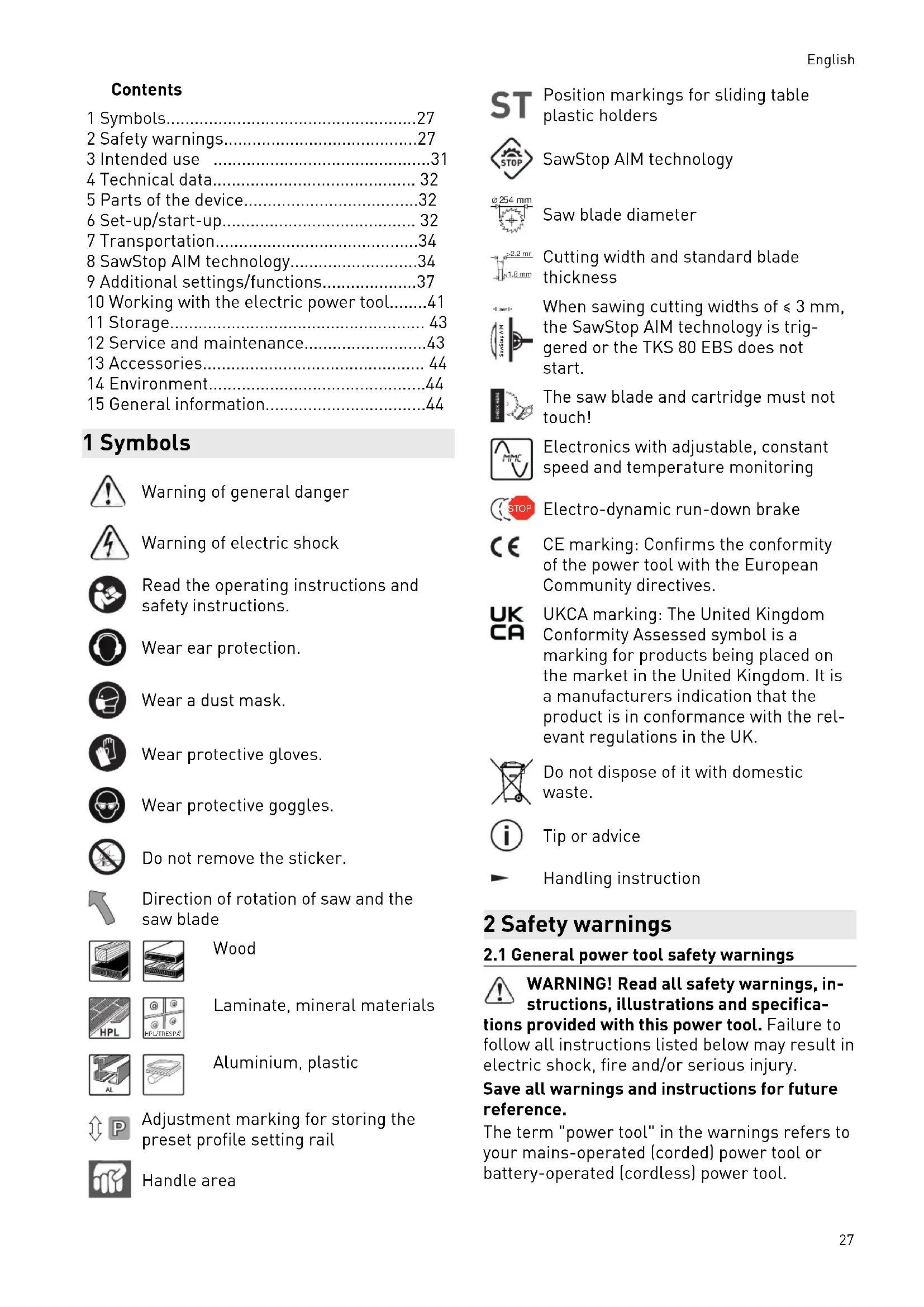 Cutting width and standard blade thickness 3mm SawStop AIM When sawing cutting widths of ≤ 3 mm, the SawStop AIM technology is trig gered or the TKS 80 EBS does not start. The saw blade and cartridge must not touch! Electronics with adjustable, constant speed and temperature monitoring STOP Electro-dynamic run-down brake CE marking: Confirms the conformity of the power tool with the European Community directives. UKCA marking: The United Kingdom Conformity Assessed symbol is a marking for products being placed on the market in the United Kingdom. It is a manufacturers indication that the product is in conformance with the rel evant regulations in the UK. Do not dispose of it with domestic waste. Tip or advice Handling instruction 2 Safety warnings