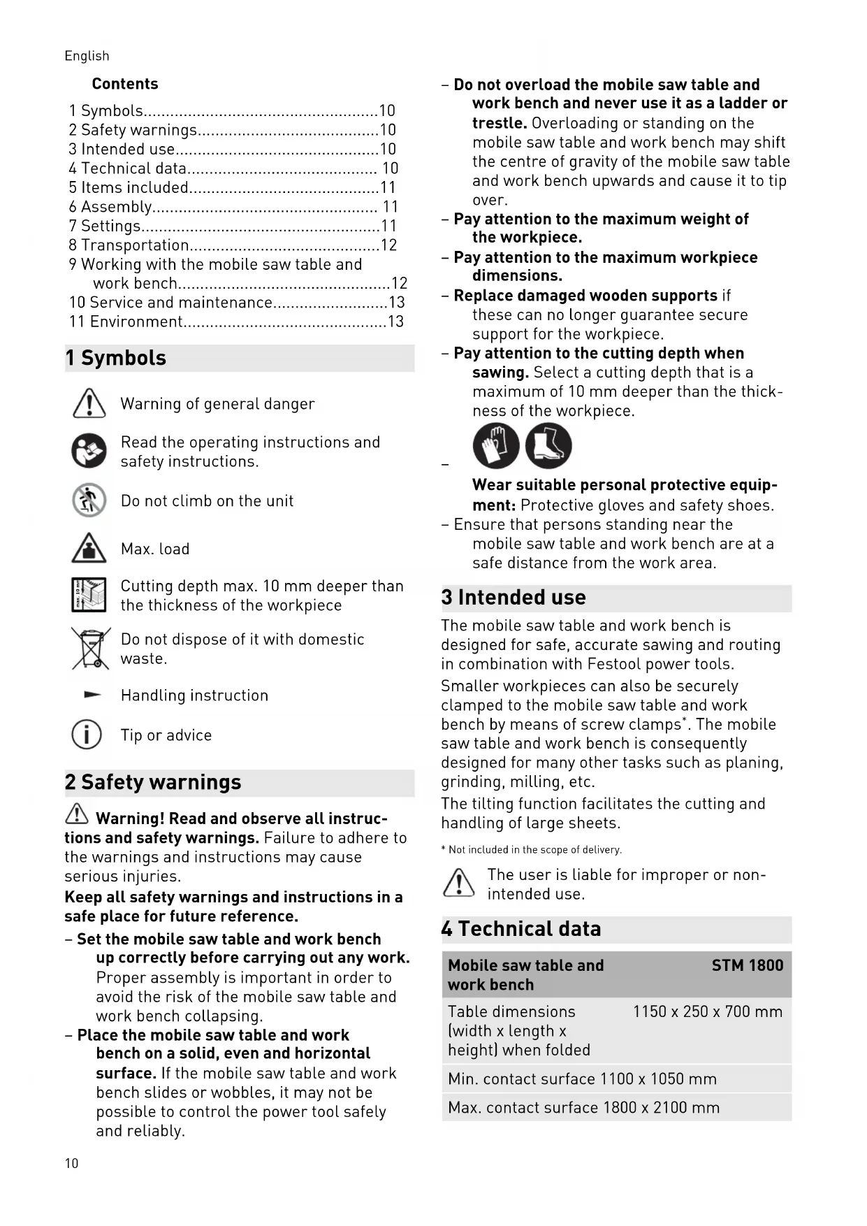- 11 Environment 1 Symbols Warning of general danger Read the operating instructions and safety instructions. Do not climb on the unit Max. load max. 10 mm Cutting depth max. 10 mm deeper than the thickness of the workpiece Do not dispose of it with domestic waste. Handling instruction Tip or advice 2 Safety warnings Warning! Read and observe all instruc tions and safety warnings. Failure to adhere to the warnings and instructions may cause serious injuries. Keep all safety warnings and instructions in a safe place for future reference. – Set the mobile saw table and work bench up correctly before carrying out any work. Proper assembly is important in order to avoid the risk of the mobile saw table and work bench collapsing. – Place the mobile saw table and work bench on a solid, even and horizontal surface. If the mobile saw table and work bench slides or wobbles, it may not be possible to control the power tool safely and reliably. – Do not overload the mobile saw table and work bench and never use it as a ladder or trestle. Overloading or standing on the mobile saw table and work bench may shift the centre of gravity of the mobile saw table and work bench upwards and cause it to tip over. – Pay attention to the maximum weight of the workpiece. – Pay attention to the maximum workpiece dimensions. – Replace damaged wooden supports if these can no longer guarantee secure support for the workpiece. – Pay attention to the cutting depth when sawing. Select a cutting depth that is a maximum of 10 mm deeper than the thick ness of the workpiece. p. 13