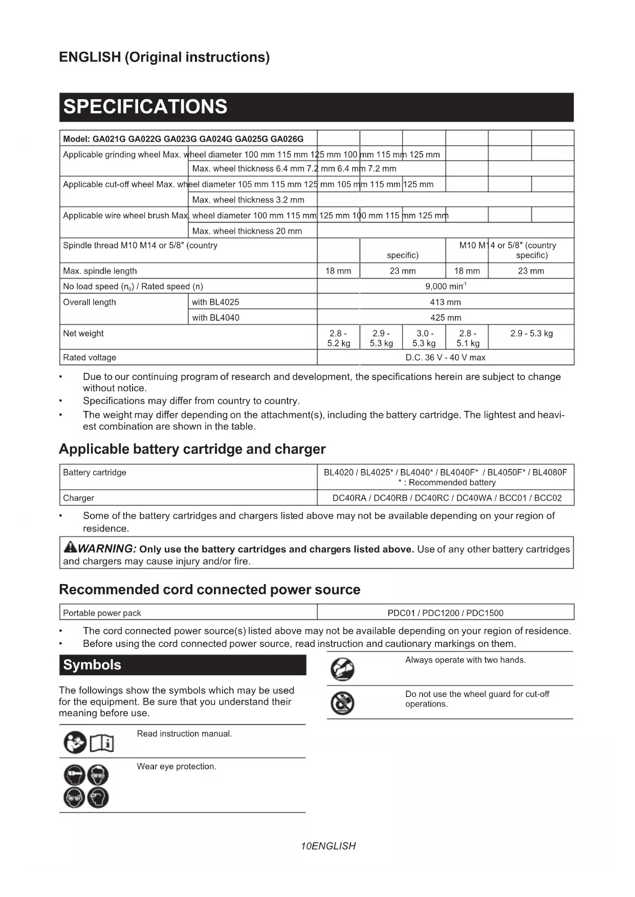 - Before using the cord connected power source, read instruction and cautionary markings on them. Symbols The followings show the symbols which may be used for the equipment. Be sure that you understand their meaning before use. Read instruction manual. Wear eye protection. Always operate with two hands. Do not use the wheel guard for cut-o operations.11 ENGLISH Ni-MH Li-ion Only for EU countries Due to the presence of hazardous com- ponents in the equipment, waste electrical and electronic equipment, accumulators and batteries may have a negative impact on the environment and human health. Do not dispose of electrical and electronic appliances or batteries with household waste! In accordance with the European Directive on waste electrical and electronic equip- ment and on accumulators and batteries and waste accumulators and batteries, as well as their adaptation to national law, waste electrical equipment, batteries and accumulators should be stored separately and delivered to a separate collection point for municipal waste, operating in accor- dance with the regulations on environmen- tal protection. This is indicated by the symbol of the crossed-out wheeled bin placed on the equipment. Intended use The tool is intended for grinding, sanding, wire brush- ing, hole cutting and cutting of metal and stone materi- als without the use of water. Noise The typical A-weighted noise level determined according to EN62841-2-3: Model Sound pressure level (L