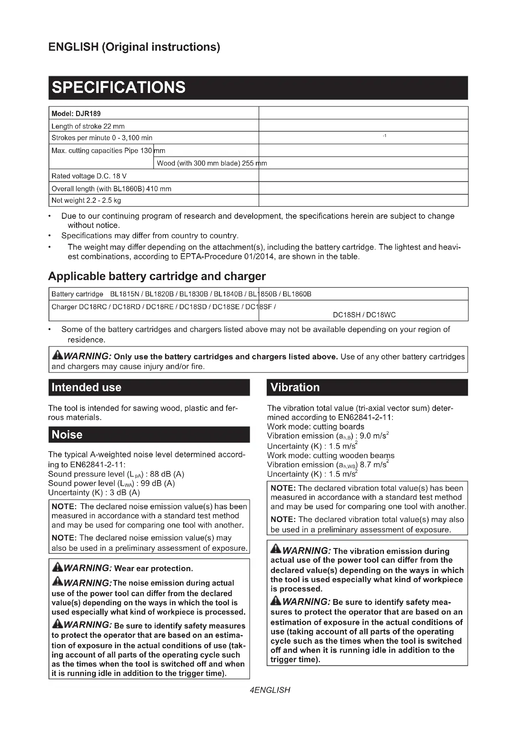 - Theweightmaydierdependingontheattachment(s),includingthebatterycartridge.Thelightestandheavi- est combinations, according to EPTA-Procedure 01/2014, are shown in the table. Applicable battery cartridge and charger Batterycartridge BL1815N / BL1820B / BL1830B / BL1840B / BL1850B / BL1860B Charger DC18RC / DC18RD / DC18RE / DC18SD / DC18SE / DC18SF / DC18SH / DC18WC