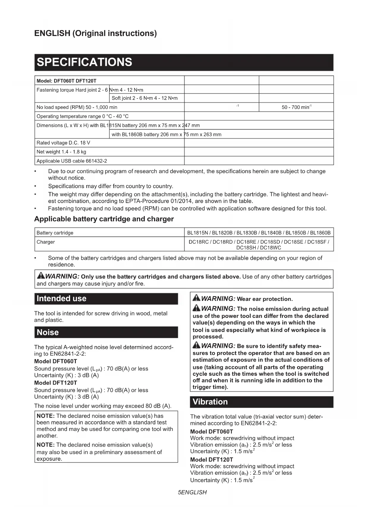 or less Uncertainty (K) : 1.5 m/s 26 ENGLISH NOTE: The declared vibration total value(s) has been measured in accordance with a standard test method and may be used for comparing one tool with another. NOTE: The declared vibration total value(s) may also be used in a preliminary assessment of exposure.