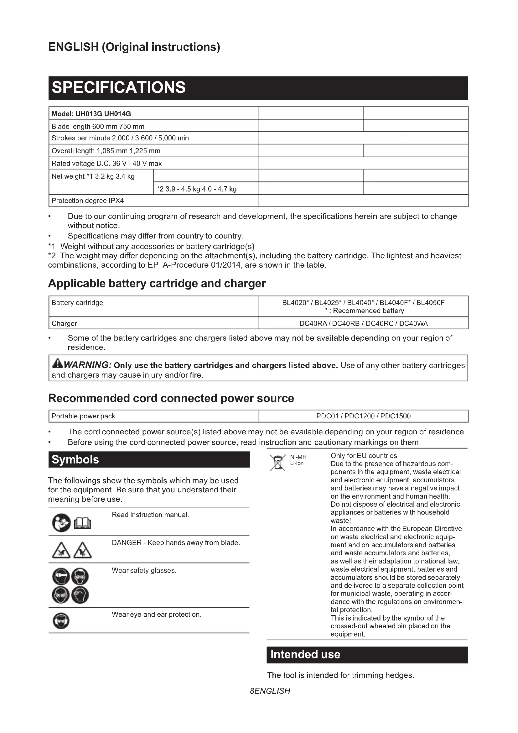 - Beforeusingthecordconnectedpowersource,readinstructionandcautionarymarkingsonthem. Symbols Thefollowingsshowthesymbolswhichmaybeused fortheequipment.Besurethatyouunderstandtheir meaningbeforeuse. Read instruction manual. DANGER-Keephandsawayfromblade. Wearsafetyglasses. Weareyeandearprotection. Ni-MH Li-ion OnlyforEUcountries Due to the presence of hazardous com- ponents in the equipment, waste electrical and electronic equipment, accumulators andbatteriesmayhaveanegativeimpact on the environment and human health. Do not dispose of electrical and electronic appliancesorbatterieswithhousehold waste! InaccordancewiththeEuropeanDirective on waste electrical and electronic equip- mentandonaccumulatorsandbatteries andwasteaccumulatorsandbatteries, as well as their adaptation to national law, wasteelectricalequipment,batteriesand accumulatorsshouldbestoredseparately and delivered to a separate collection point for municipal waste, operating in accor- dance with the regulations on environmen- tal protection. Thisisindicatedbythesymbolofthe crossed-outwheeledbinplacedonthe equipment. Intended use The tool is intended for trimming hedges.9 ENGLISH Noise ThetypicalA-weightednoiseleveldeterminedaccordingtoEN62841-4-2: Model Sound pressure levelGuaranteed sound power levelMeasured sound power level