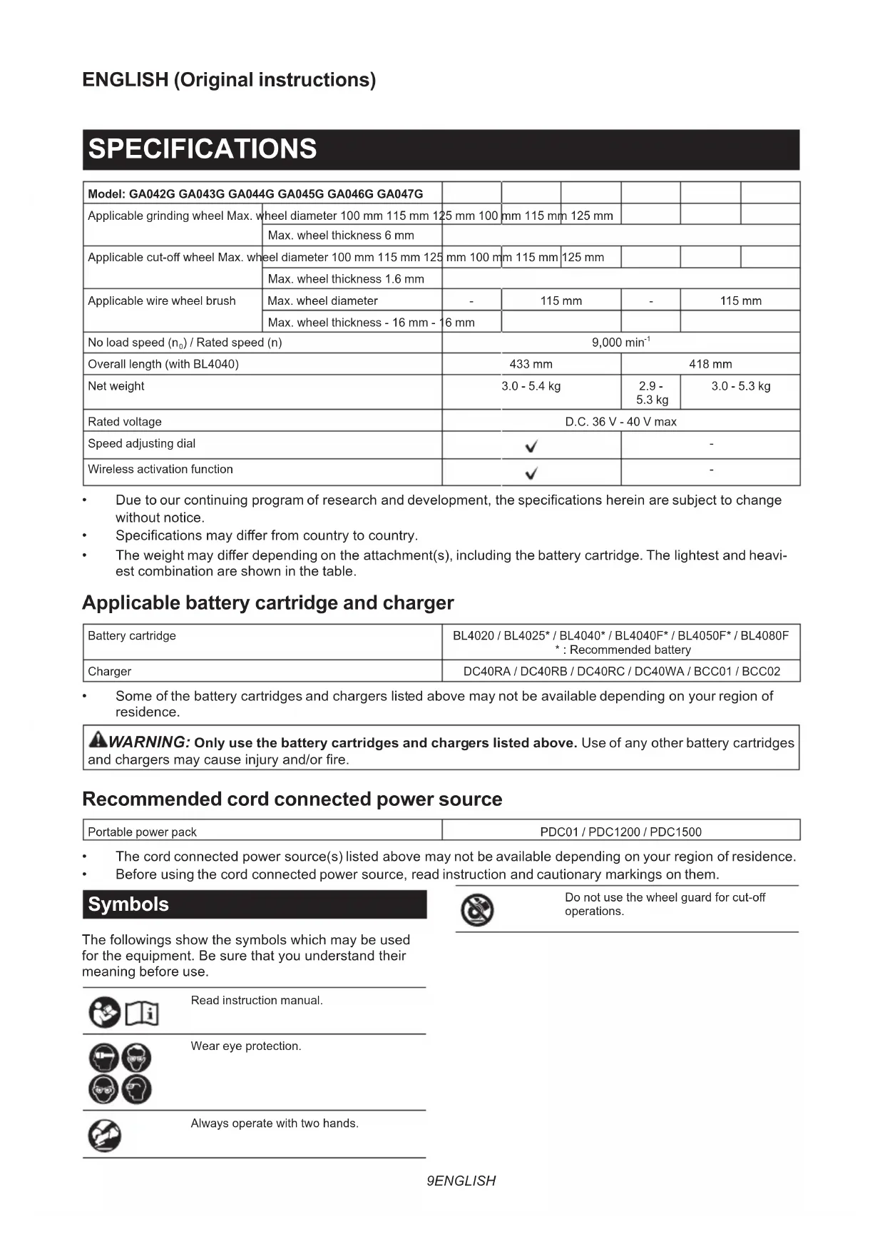 - Before using the cord connected power source, read instruction and cautionary markings on them. Symbols The followings show the symbols which may be used for the equipment. Be sure that you understand their meaning before use. Read instruction manual. Wear eye protection. Always operate with two hands. Do not use the wheel guard for cut-o operations.10 ENGLISH Ni-MH Li-ion Only for EU countries Due to the presence of hazardous com- ponents in the equipment, waste electrical and electronic equipment, accumulators and batteries may have a negative impact on the environment and human health. Do not dispose of electrical and electronic appliances or batteries with household waste! In accordance with the European Directive on waste electrical and electronic equip- ment and on accumulators and batteries and waste accumulators and batteries, as well as their adaptation to national law, waste electrical equipment, batteries and accumulators should be stored separately and delivered to a separate collection point for municipal waste, operating in accor- dance with the regulations on environmen- tal protection. This is indicated by the symbol of the crossed-out wheeled bin placed on the equipment. Intended use The tool is intended for grinding, sanding, wire brushing and cutting of metal and stone materials without the use of water. Noise The typical A-weighted noise level determined according to EN62841-2-3: Model Sound pressure level (L