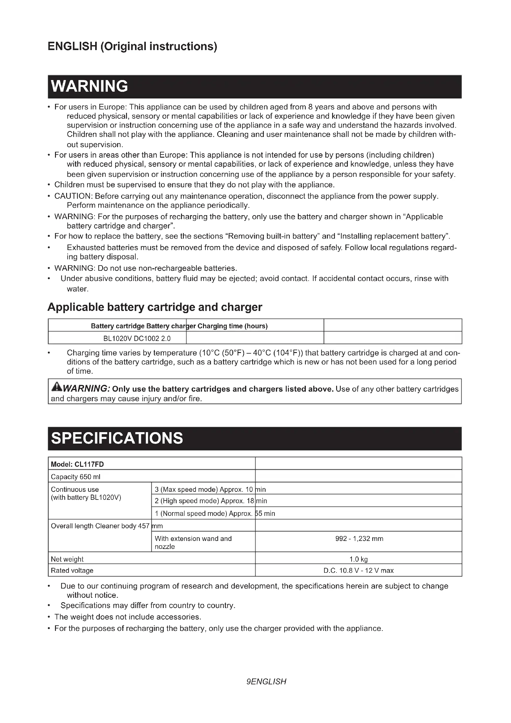 andchargersmaycauseinjuryand/orre. SPECIFICATIONS Model: CL117FD Capacity 650 ml Continuous use (with battery BL1020V) 3 (Max speed mode) Approx. 10 min 2 (High speed mode) Approx. 18 min 1 (Normal speed mode) Approx. 55 min Overall length Cleaner body 457 mm With extension wand and nozzle