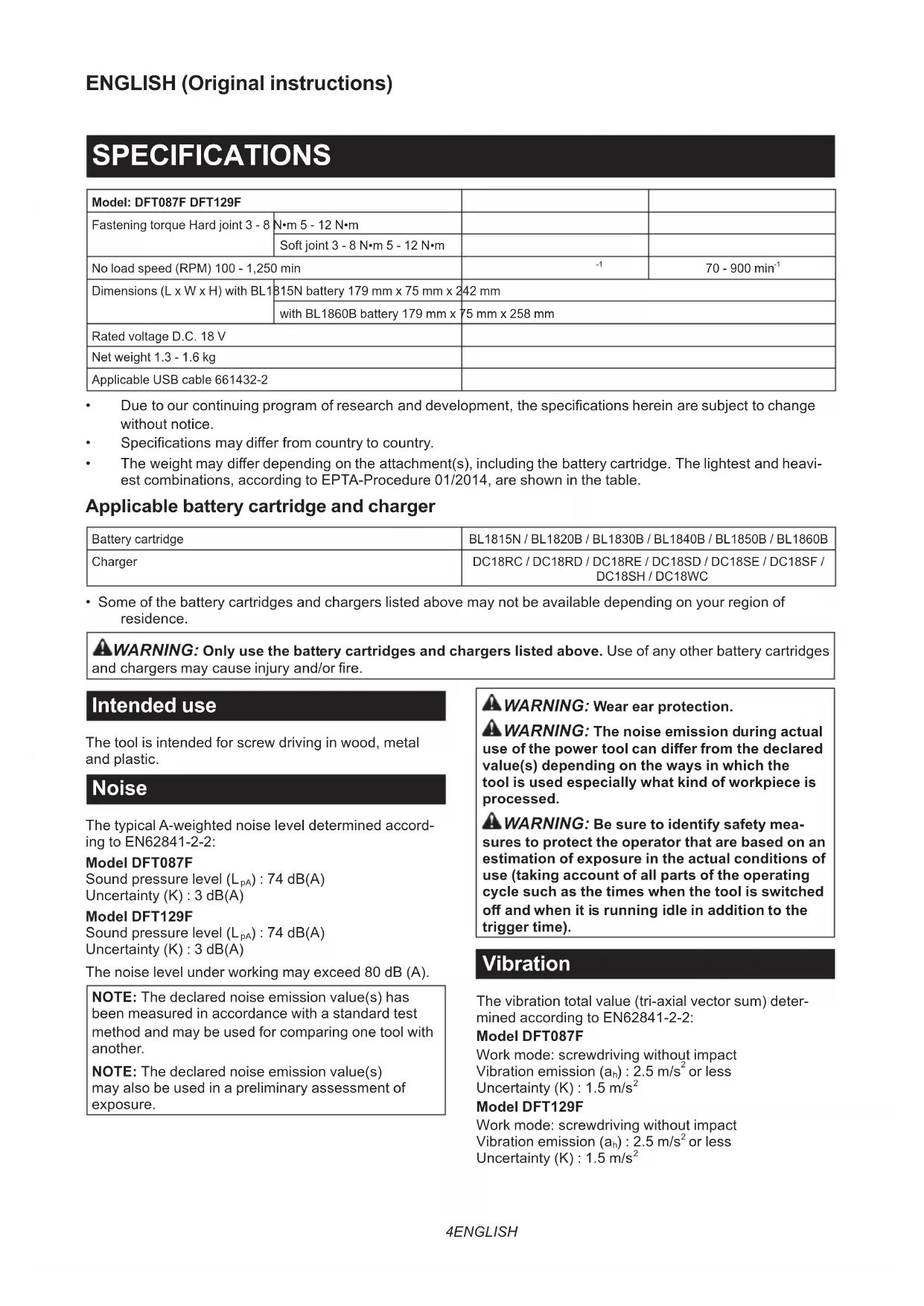 or less Uncertainty (K) : 1.5 m/s 25 ENGLISH NOTE: The declared vibration total value(s) has been measured in accordance with a standard test method and may be used for comparing one tool with another. NOTE: The declared vibration total value(s) may also be used in a preliminary assessment of exposure.