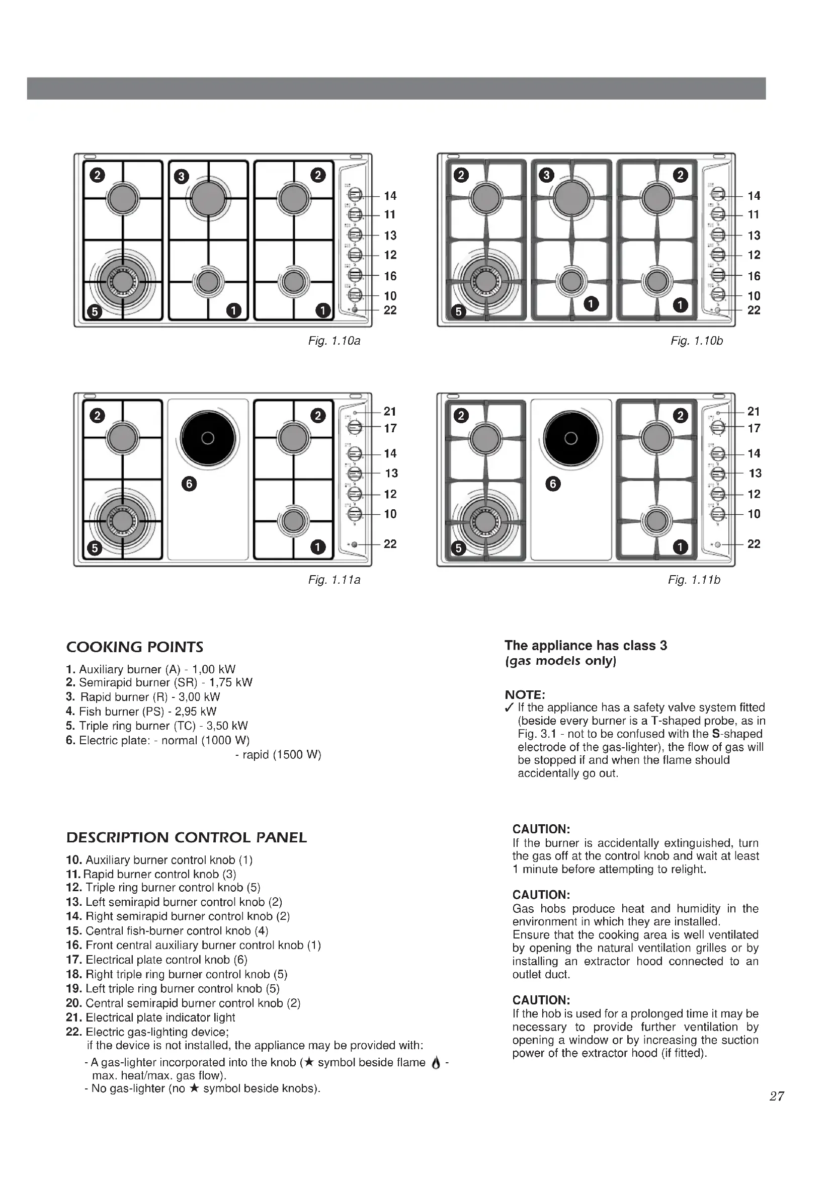 - rapid (1500 W) NOTE: ✓ If the appliance has a safety valve system fitted (beside every burner is a T-shaped probe, as in Fig. 3.1 - not to be confused with the S-shaped electrode of the gas-lighter), the flow of gas will be stopped if and when the flame should accidentally go out. The appliance has class 3 (gas models only) CAUTION: If the burner is accidentally extinguished, turn the gas off at the control knob and wait at least 1 minute before attempting to relight. CAUTION: Gas hobs produce heat and humidity in the environment in which they are installed. Ensure that the cooking area is well ventilated by opening the natural ventilation grilles or by installing an extractor hood connected to an outlet duct. CAUTION: If the hob is used for a prolonged time it may be necessary to provide further ventilation by opening a window or by increasing the suction power of the extractor hood (if fitted).28