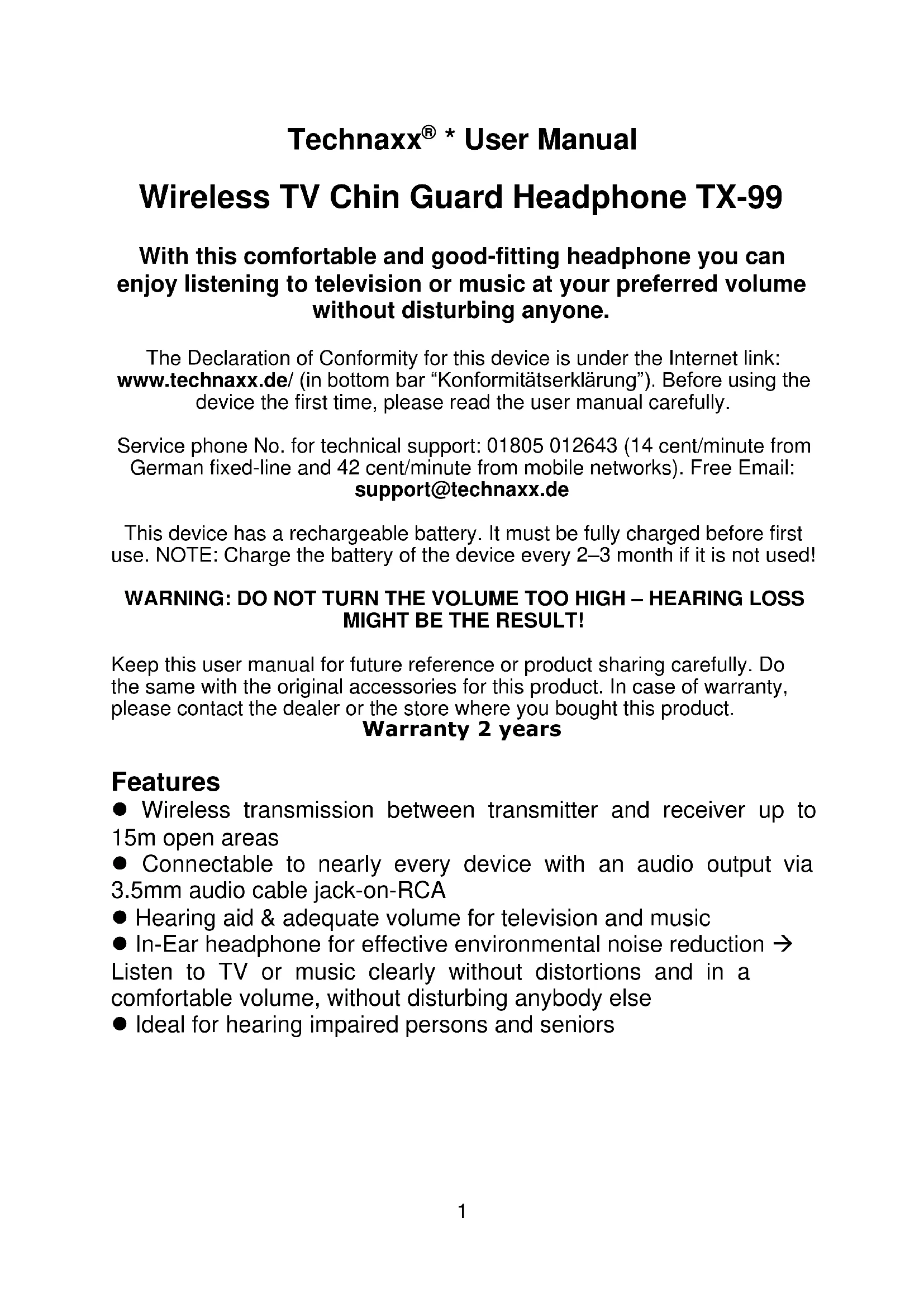 - User Manual Wireless TV Chin Guard Headphone TX-99 With this comfortable and good-fitting headphone you can enjoy listening to television or music at your preferred volume without disturbing anyone. The Declaration of Conformity for this device is under the Internet link: www.technaxx.de/ (in bottom bar “Konformitätserklärung”). Before using the device the first time, please read the user manual carefully. Service phone No. for technical support: 01805 012643 (14 cent/minute from German fixed-line and 42 cent/minute from mobile networks). Free Email: support@technaxx.de This device has a rechargeable battery. It must be fully charged before first use. NOTE: Charge the battery of the device every 2–3 month if it is not used!